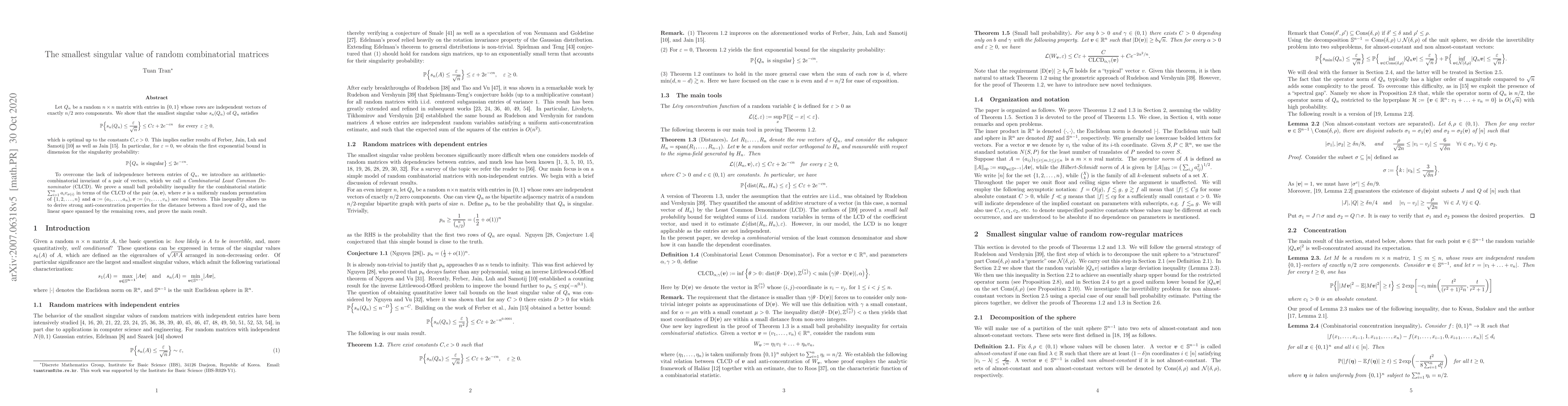 This paper investigates the smallest singular value of random combinatorial matrices $Q_n$ with $\{0,1\}$ entries and half zeros per row, proving an optimal probability bound for its singularity. It introduces a Combinatorial Least Common Denominator (CLCD) to handle dependencies and derives a small ball probability inequality to establish strong anti-concentration properties, leading to an exponential bound on the singularity probability.
