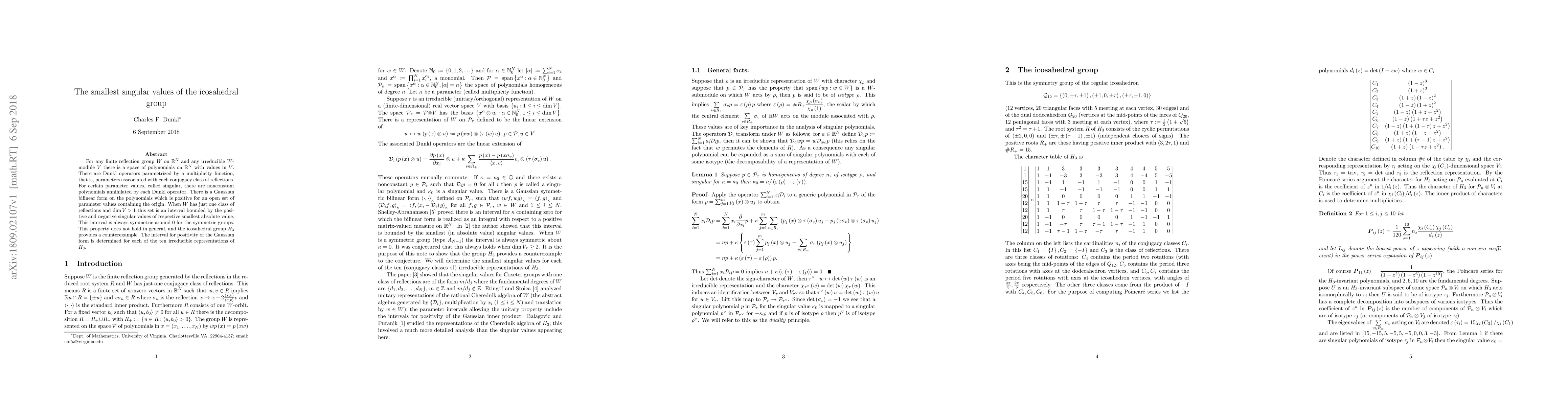 Researchers studied the smallest singular values of the icosahedral group, finding that for a certain type of math problem related to reflection groups and modules, the positive and negative singular values don't always form a symmetric interval around zero.