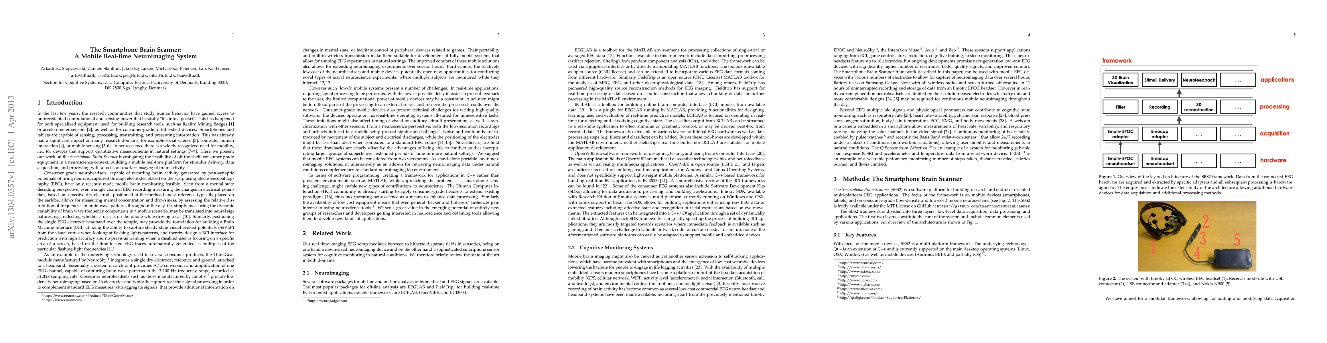 The Smartphone Brain Scanner is a mobile, real-time EEG imaging system combining low-cost wireless EEG sensors with smartphones for portable brain imaging. Despite lower signal quality compared to standard lab equipment, it offers new opportunities for neuroimaging in everyday contexts.