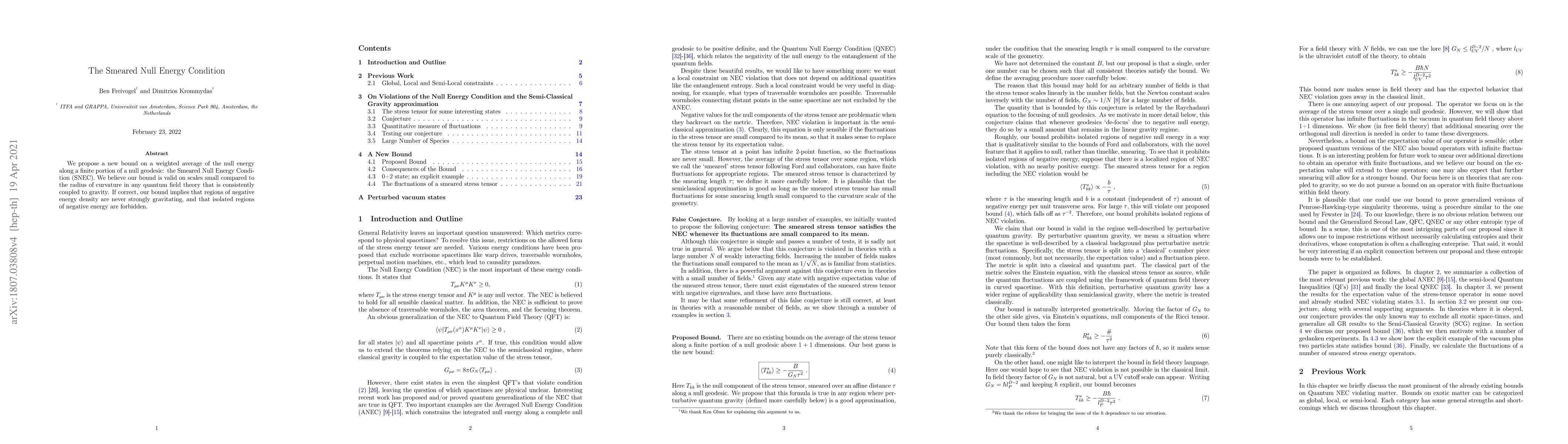 The paper proposes a new bound on the average null energy density along a finite portion of a null geodesic, suggesting it holds in quantum field theories coupled to gravity. If valid, this bound implies that regions with negative energy density cannot strongly influence gravity, and isolated negative energy regions are prohibited.