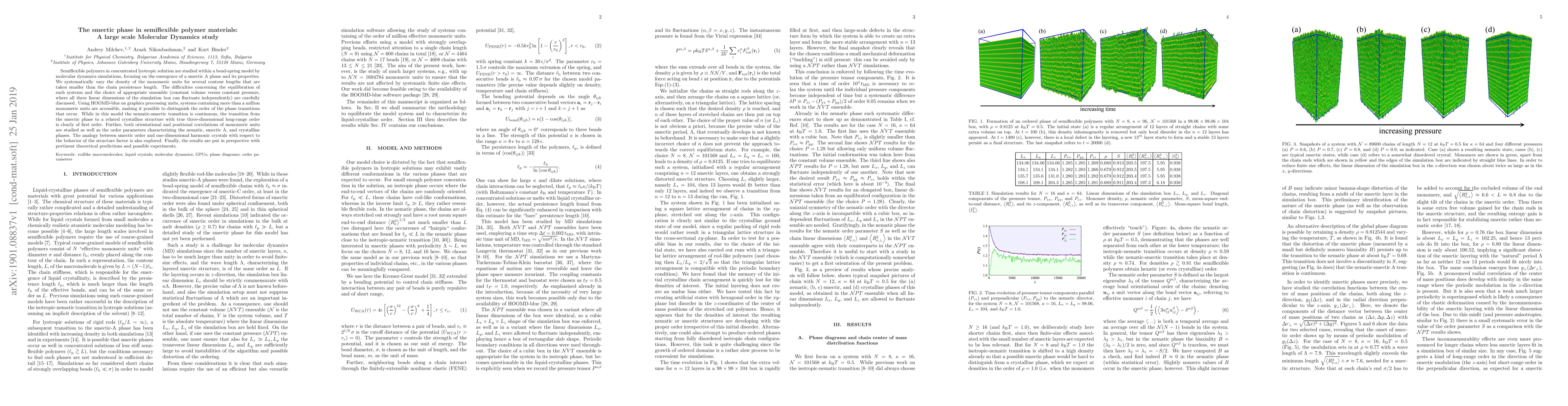 Semiflexible polymers in concentrated lyotropic solution are studied within a bead-spring model by molecular dynamics simulations, focusing on the emergence of a smectic A phase and its properties. We systematically vary the density of the monomeric units for several contour lengths that are taken smaller than the chain persistence length. The difficulties concerning the equilibration of such systems and the choice of appropriate ensemble (constant volume versus constant pressure, where all three linear dimensions of the simulation box can fluctuate independently) are carefully discussed. Using HOOMD-blue on graphics processing units, systems containing more than a million monomeric units are accessible, making it possible to distinguish the order of the phase transitions that occur. While in this model the nematic-smectic transition is continuous, the transition from the smectic phase to a related crystalline structure with true three-dimensional long-range order is clearly of first order. Further, both orientational and positional correlations of monomeric units are studied as well as the order parameters characterizing the nematic, smectic A, and crystalline phases. The analogy between smectic order and one-dimensional harmonic crystals with respect to the behavior of the structure factor is also explored. Finally, the results are put in perspective with pertinent theoretical predictions and possible experiments.