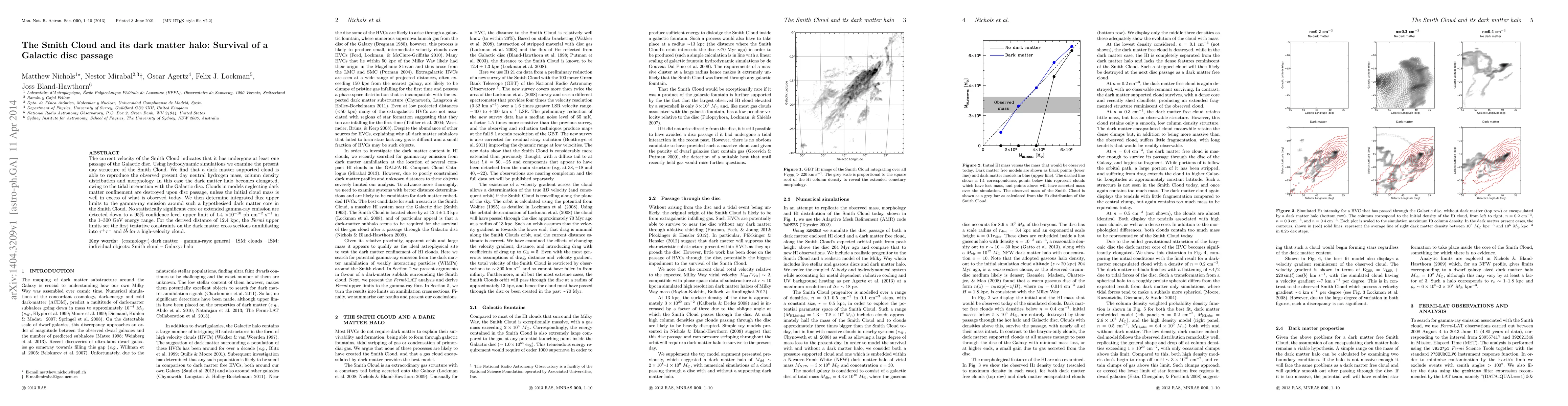 The Smith Cloud survived a passage through the Galactic disc, supported by a dark matter halo, as shown by hydrodynamic simulations. No significant gamma-ray emission from the cloud's dark matter core was detected, setting constraints on its annihilation cross sections.