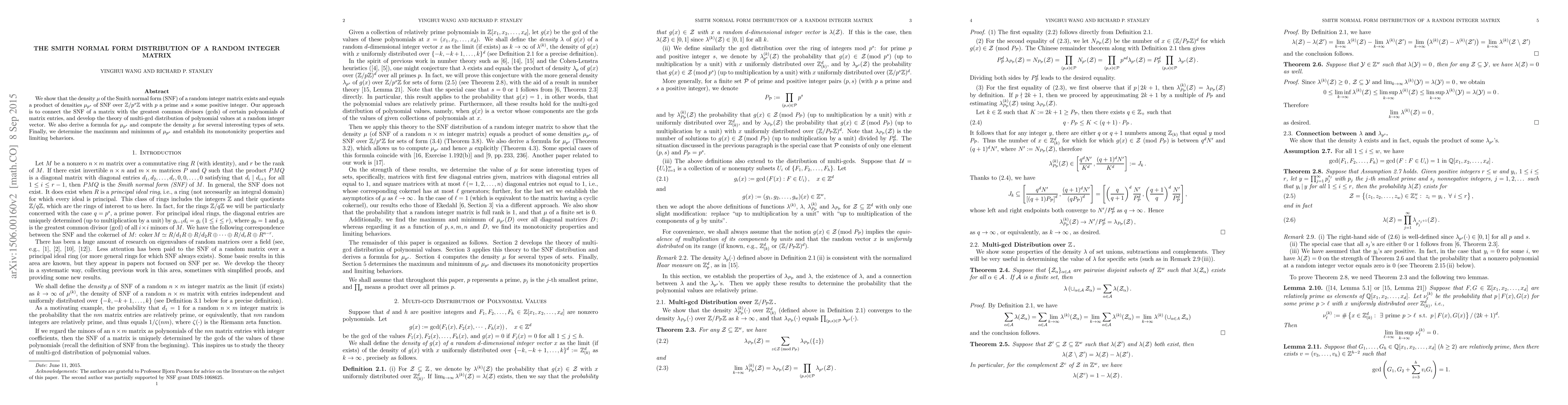 This paper establishes the existence of a density $\mu$ for the Smith normal form of random integer matrices, showing it equals a product of densities $\mu_{p^s}$ over $\mathbb{Z}/p^s\mathbb{Z}$. It connects the SNF to the distribution of gcds of matrix entry polynomials and derives a formula for $\mu_{p^s}$.