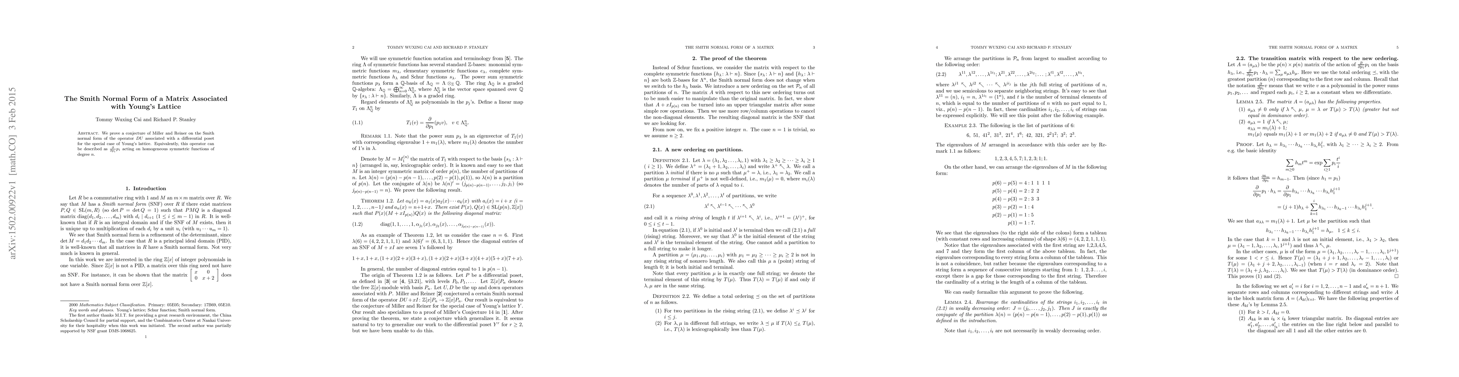 We prove a conjecture of Miller and Reiner on the Smith normal form of the operator $DU$ associated with a differential poset for the special case of Young's lattice. Equivalently, this operator can be described as $\frac{\partial}{\partial p_1}p_1$ acting on homogeneous symmetric functions of degree $n$.