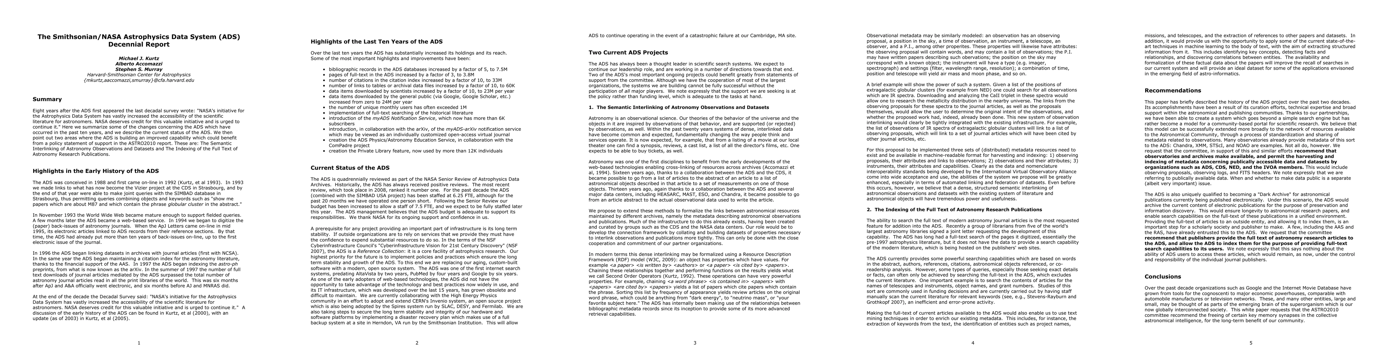 The Smithsonian/NASA Astrophysics Data System (ADS) Decennial Report reviews changes and current status over the past decade, highlighting its increased accessibility of scientific literature. It emphasizes the need for policy support in enhancing semantic interlinking of astronomy datasets and full-text indexing of research publications.