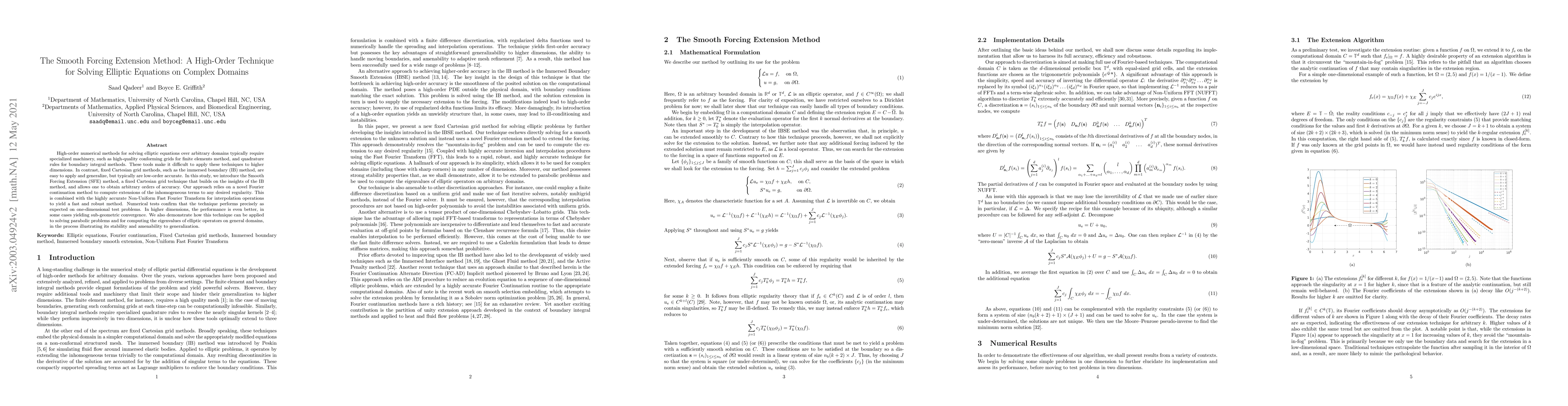 The Smooth Forcing Extension (SFE) method introduces a high-order fixed Cartesian grid technique for solving elliptic equations on complex domains, leveraging Fourier continuation and Non-Uniform Fast Fourier Transform for accuracy. Numerical tests show it achieves expected precision in one dimension and sub-geometric convergence in higher dimensions, with successful application to parabolic problems and eigenvalue computations.