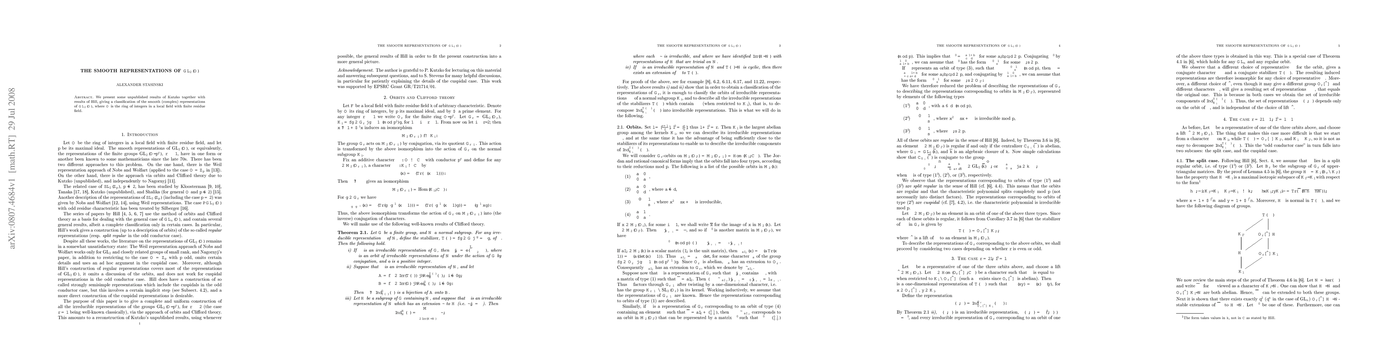 We present some unpublished results of Kutzko together with results of Hill, giving a classification of the smooth (complex) representations of $\mathrm{GL}_{2}(\mathcal{O})$, where $\mathcal{O}$ is the ring of integers in a local field with finite residue field.