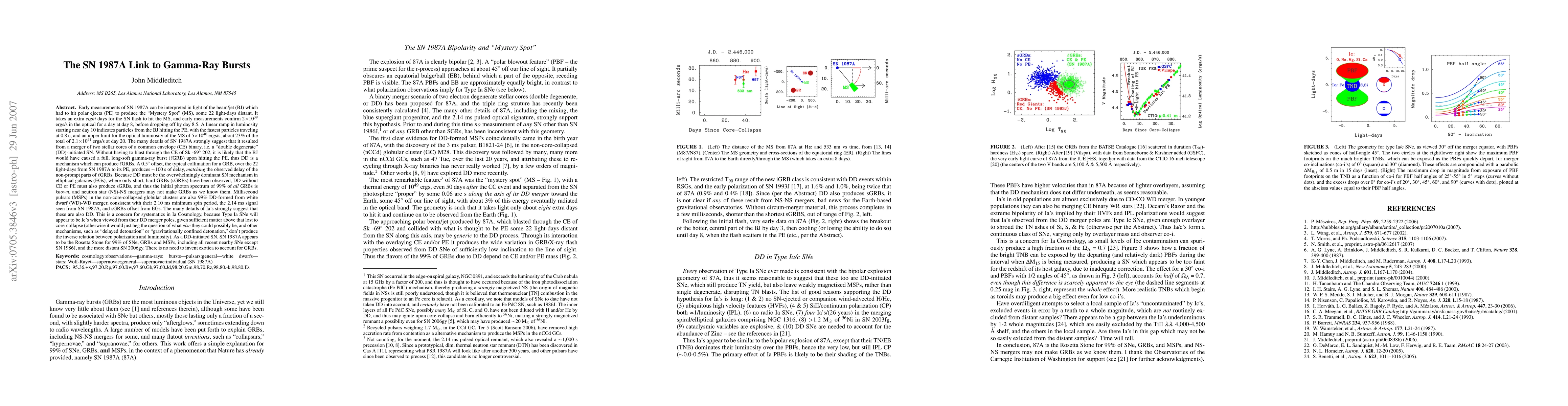 Early measurements of SN 1987A indicate a beam/jet (BJ) which hit polar ejecta (PE) to produce the "Mystery Spot" (MS). The SN flash takes an extra 8 d to hit the MS, and this was confirmed at 2e39 ergs/s in the optical at day 8. A ramp in luminosity starting near day 10 indicates particles from the BJ hitting the PE, with the fastest particles traveling at 0.8 c, and an upper limit for the optical luminosity of the MS of 5e40 ergs/s at day 20. The details of SN 1987A strongly suggest that it resulted from a merger of 2 stellar cores of a common envelope (CE) binary, i.e. a "double-degenerate" (DD)-initiated SN, and is thus the Rosetta Stone for 99% of MSPs in the non-core-collapsed globular clusters, GRBs, and SNe, including all recent nearby SNe except SN 1986J and the more distant SN 2006gy. Without having to blast through the CE of Sk -69 202, it is likely that the BJ would have caused a full, long-soft gamma-ray burst (lGRB) upon hitting the PE, thus DD can produce lGRBs. The typical 0.5 deg collimation of a GRB, over the 22 lt-d from SN 1987A to its PE, produces ~100 s of delay, MATCHING the observed delay of the non-prompt parts of lGRBs. Because DD must be the dominant SN mechanism in elliptical galaxies, where only short, hard GRBs (sGRBs) have been observed, DD without CE or PE must also make sGRBs, thus the initial photon spectrum of 99% of ALL GRBs is KNOWN, & neutron star (NS)-NS mergers may not make GRBs as we know them. Observations of Ia's strongly suggest that these are also DD, implying another systematic effect in Ia Cosmology, as Ia's will appear to be Ic's when viewed from their DD merger poles, given sufficient matter above that lost to core- collapse (otherwise it would just beg the question of what ELSE they could possibly be). There is no need to invent exotica, such as collapsars or hypernovae, to account for GRBs.