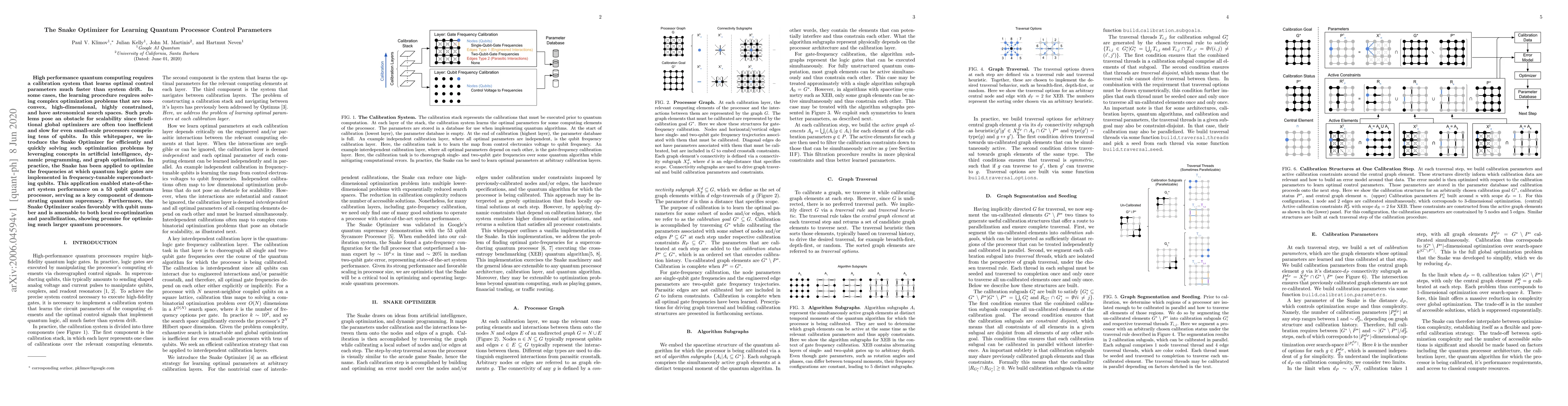 High performance quantum computing requires a calibration system that learns optimal control parameters much faster than system drift. In some cases, the learning procedure requires solving complex optimization problems that are non-convex, high-dimensional, highly constrained, and have astronomical search spaces. Such problems pose an obstacle for scalability since traditional global optimizers are often too inefficient and slow for even small-scale processors comprising tens of qubits. In this whitepaper, we introduce the Snake Optimizer for efficiently and quickly solving such optimization problems by leveraging concepts in artificial intelligence, dynamic programming, and graph optimization. In practice, the Snake has been applied to optimize the frequencies at which quantum logic gates are implemented in frequency-tunable superconducting qubits. This application enabled state-of-the-art system performance on a 53 qubit quantum processor, serving as a key component of demonstrating quantum supremacy. Furthermore, the Snake Optimizer scales favorably with qubit number and is amenable to both local re-optimization and parallelization, showing promise for optimizing much larger quantum processors.