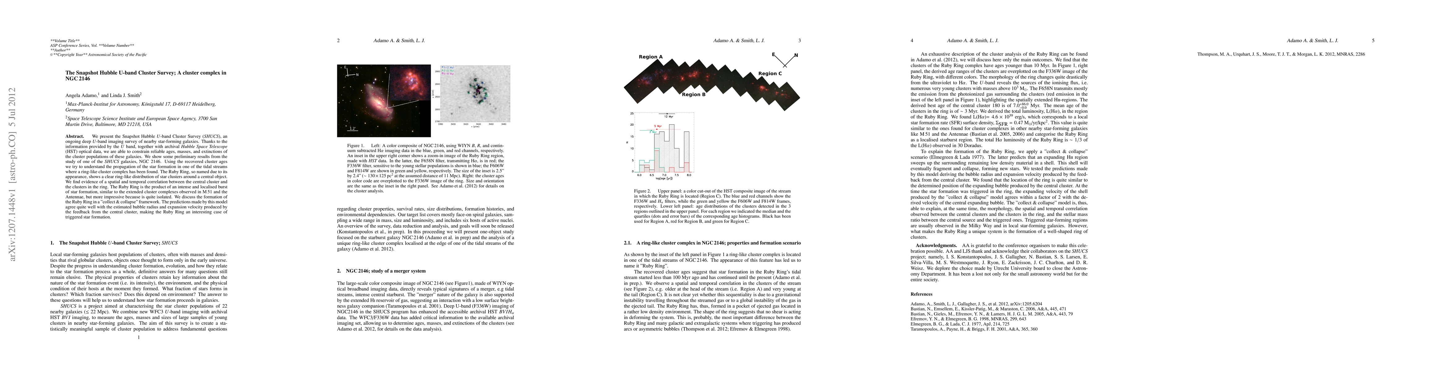 We present the Snapshot Hubble U-band Cluster Survey (SHUCS), an ongoing deep U-band imaging survey of nearby star-forming galaxies. Thanks to the information provided by the U band, together with archival Hubble Space Telescope (HST) optical data, we are able to constrain reliable ages, masses, and extinctions of the cluster populations of these galaxies. We show some preliminary results from the study of one of the SHUCS galaxies, NGC 2146. Using the recovered cluster ages we try to understand the propagation of the star formation in one of the tidal streams where a ring-like cluster complex has been found. The Ruby Ring, so named due to its appearance, shows a clear ring-like distribution of star clusters around a central object. We find evidence of a spatial and temporal correlation between the central cluster and the clusters in the ring. The Ruby Ring is the product of an intense and localised burst of star formation, similar to the extended cluster complexes observed in M 51 and the Antennae, but more impressive because is quite isolated. We discuss the formation of the Ruby Ring in a "collect & collapse" framework. The predictions made by this model agree quite well with the estimated bubble radius and expansion velocity produced by the feedback from the central cluster, making the Ruby Ring an interesting case of triggered star formation.