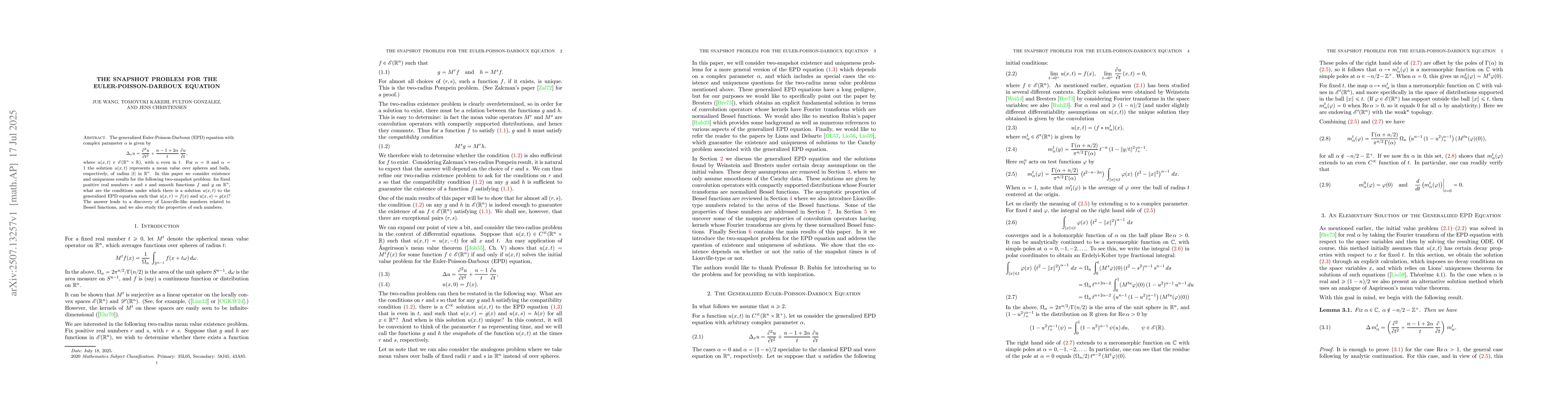 The generalized Euler-Poisson-Darboux (EPD) equation with complex parameter $\alpha$ is given by $$ \Delta_x u=\frac{\partial^2 u}{\partial t^2}+\frac{n-1+2\alpha}{t}\,\frac{\partial u}{\partial t}, $$ where $u(x,t)\in \mathscr E(\mathbb R^n\times \mathbb R)$, with $u$ even in $t$. For $\alpha=0$ and $\alpha=1$ the solution $u(x,t)$ represents a mean value over spheres and balls, respectively, of radius $|t|$ in $\mathbb R^n$. In this paper we consider existence and uniqueness results for the following two-snapshot problem: for fixed positive real numbers $r$ and $s$ and smooth functions $f$ and $g$ on $\mathbb R^n$, what are the conditions under which there is a solution $u(x,t)$ to the generalized EPD equation such that $u(x,r)=f(x)$ and $u(x,s)=g(x)$? The answer leads to a discovery of Liouville-like numbers related to Bessel functions, and we also study the properties of such numbers.