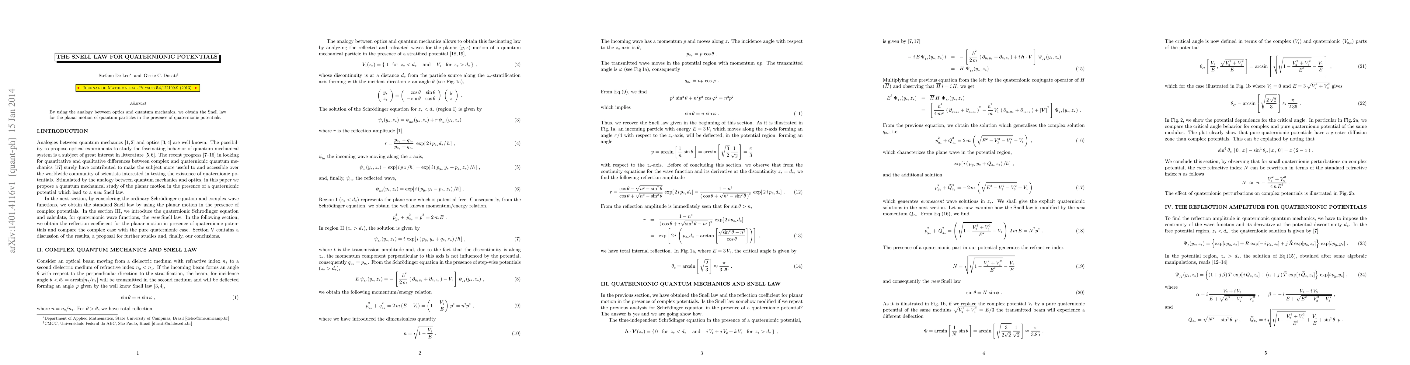 By using the analogy between optics and quantum mechanics, we obtain the Snell law for the planar motion of quantum particles in the presence of quaternionic potentials.