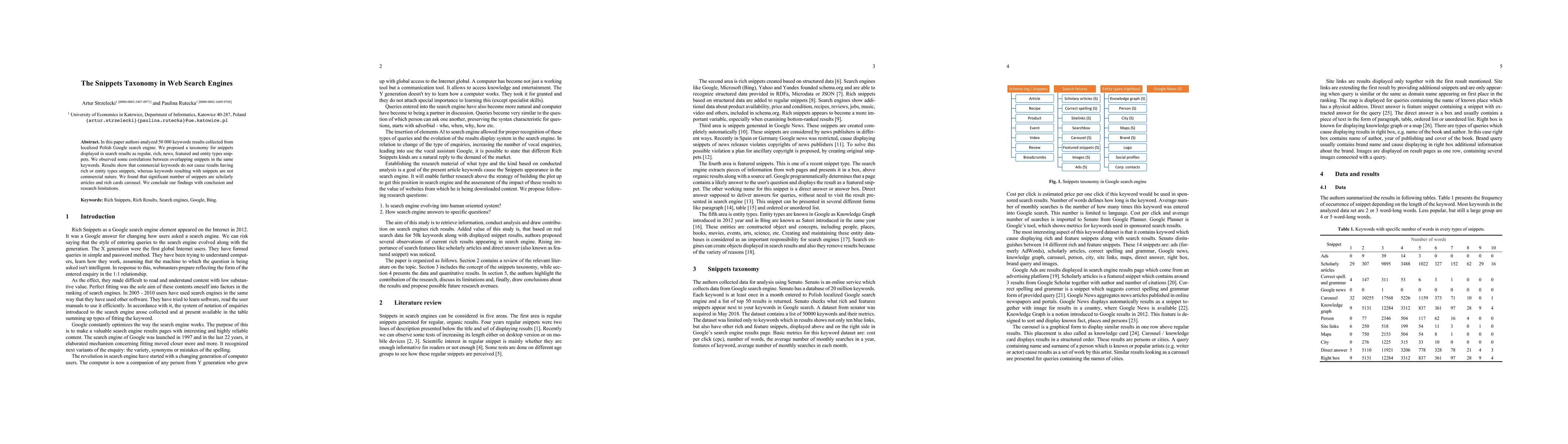 This paper proposes a taxonomy for snippets in Polish Google search results, categorizing them into regular, rich, news, featured, and entity types. The study found that non-commercial keywords are more likely to generate snippets, with scholarly articles and rich cards being prevalent.