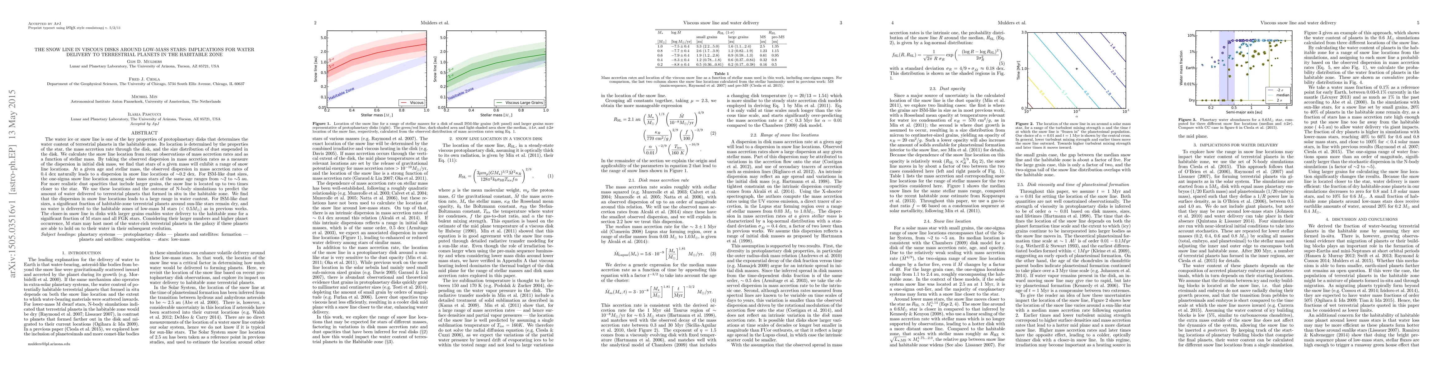 This paper investigates the snow line's location in viscous disks around low-mass stars, determining its impact on water delivery to terrestrial planets in the habitable zone. It finds a significant range in snow line locations due to dispersion in mass accretion rates, leading to varied water content in planets, with M stars potentially hosting most water-rich planets due to closer snow lines and larger grains.