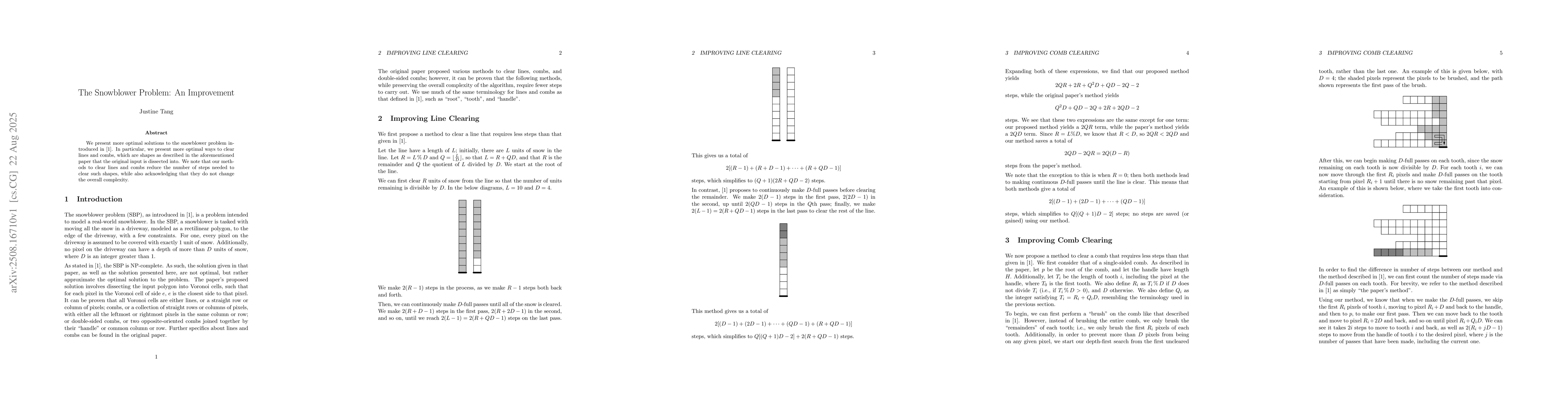 We present more optimal solutions to the snowblower problem introduced in arXiv:cs/0603026. In particular, we present more optimal ways to clear lines and combs, which are shapes as described in the aforementioned paper that the original input is dissected into. We note that our methods to clear lines and combs reduce the number of steps needed to clear such shapes, while also acknowledging that they do not change the overall complexity.