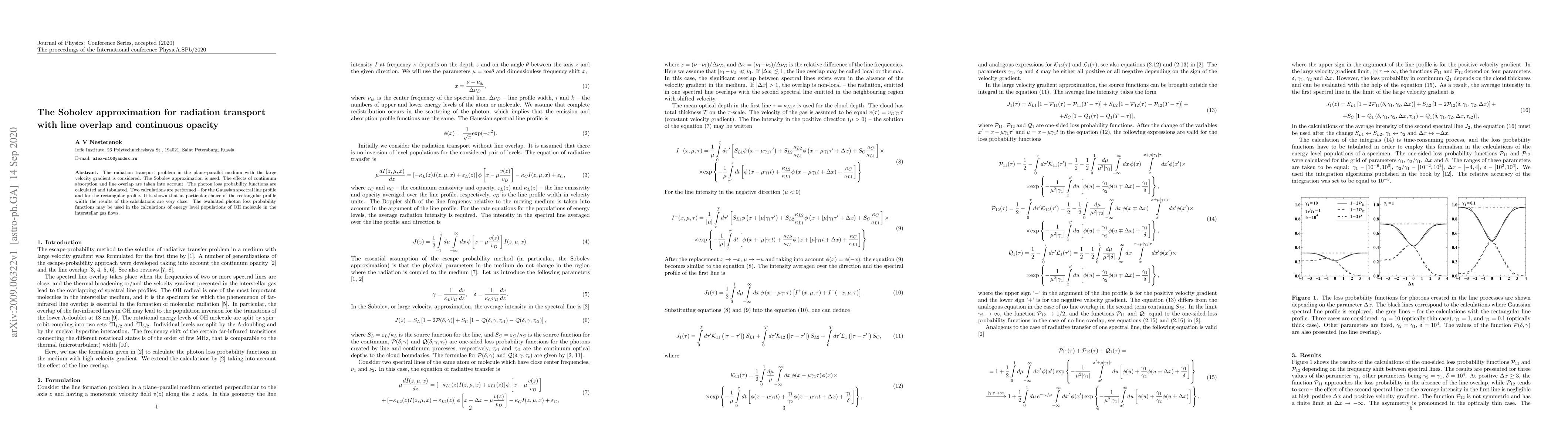 The paper applies the Sobolev approximation to the radiation transport problem in a plane-parallel medium with significant velocity gradients, considering continuum absorption and line overlap. Calculations for Gaussian and rectangular spectral line profiles are presented, showing close results for a specific rectangular profile width. These findings can aid in estimating energy level populations of OH molecules in interstellar gas flows.