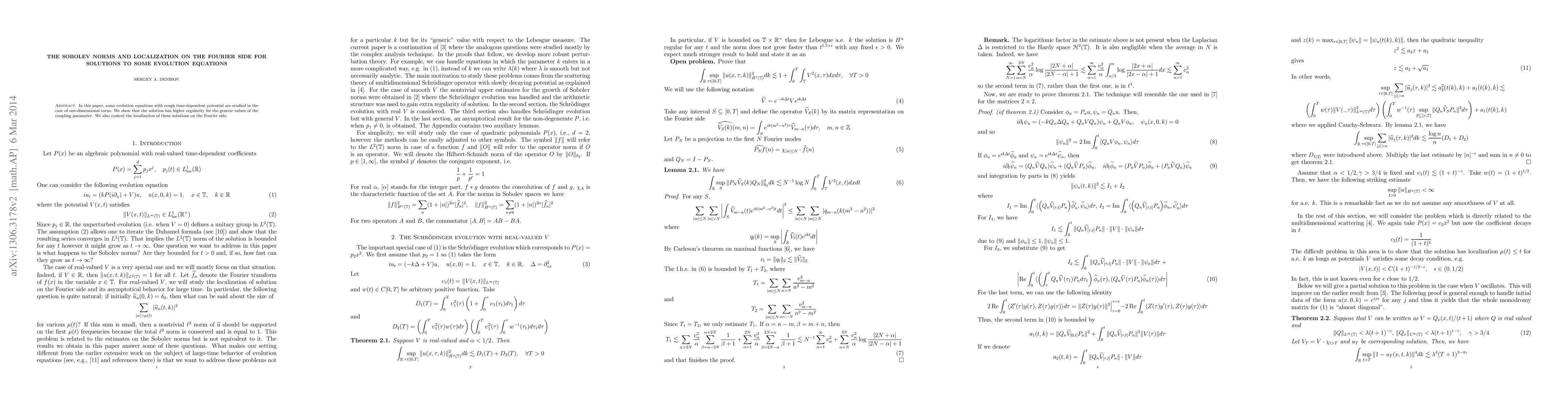 Some evolution equations with rough time-dependent potential are studied in the case of one-dimensional torus. We show that the solution has higher regularity for the generic values of the coupling constant. The asymptotics for large time and the localization on the Fourier side are studied.