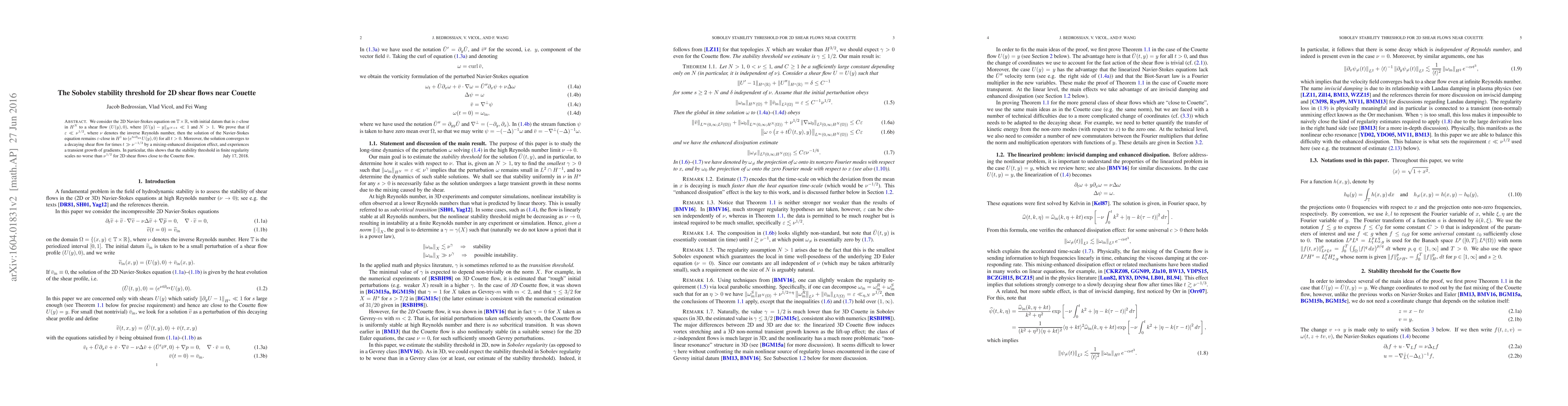 This paper proves the stability threshold for 2D shear flows near Couette in the Navier-Stokes equation, showing that solutions remain close to the shear flow if the initial perturbation is small enough relative to $\nu^{1/2}$, where $\nu$ is the inverse Reynolds number. The study also demonstrates transient gradient growth and eventual convergence to a decaying shear flow due to enhanced dissipation.