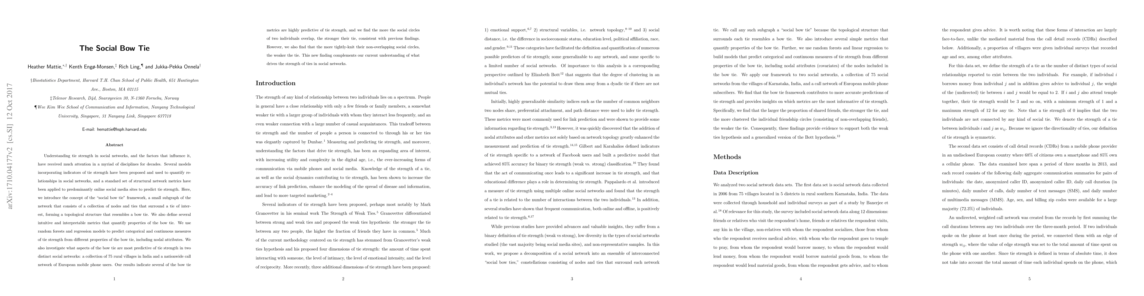 The "social bow tie" framework proposes a new method to predict tie strength in social networks by analyzing a small subgraph centered around a tie of interest. Metrics derived from this bow tie structure are highly predictive of tie strength, with overlapping social circles indicating stronger ties, while tightly-knit non-overlapping circles suggest weaker ties.