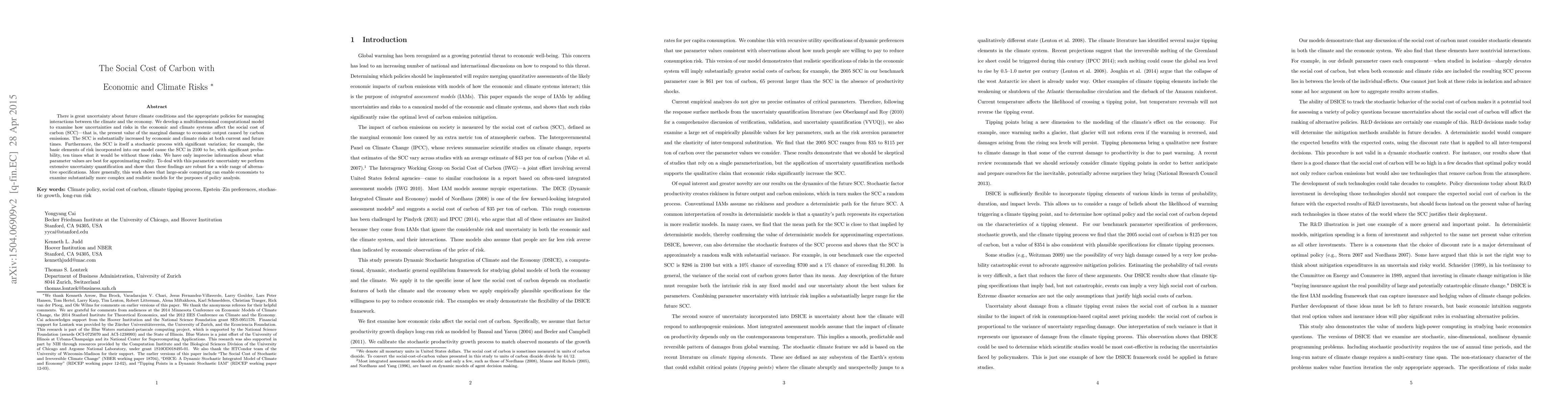 This paper develops a multidimensional computational model to assess how economic and climate risks affect the social cost of carbon (SCC), finding that SCC is significantly increased by these risks. The study demonstrates that SCC is a stochastic process with substantial variation, especially under current and future uncertainties.