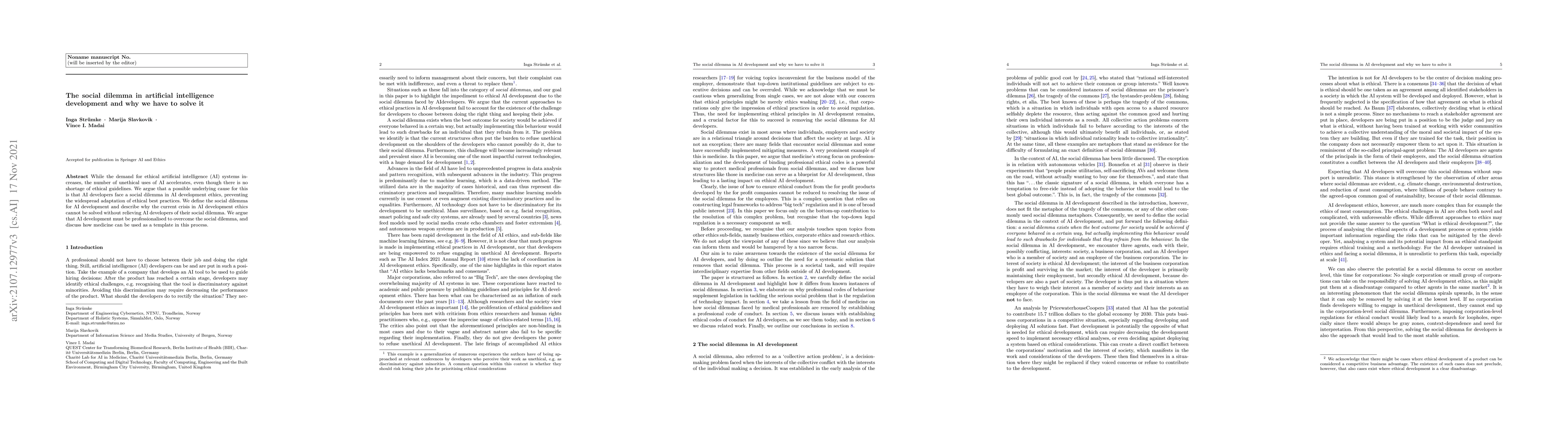 While the demand for ethical artificial intelligence (AI) systems increases, the number of unethical uses of AI accelerates, even though there is no shortage of ethical guidelines. We argue that a possible underlying cause for this is that AI developers face a social dilemma in AI development ethics, preventing the widespread adaptation of ethical best practices. We define the social dilemma for AI development and describe why the current crisis in AI development ethics cannot be solved without relieving AI developers of their social dilemma. We argue that AI development must be professionalised to overcome the social dilemma, and discuss how medicine can be used as a template in this process.