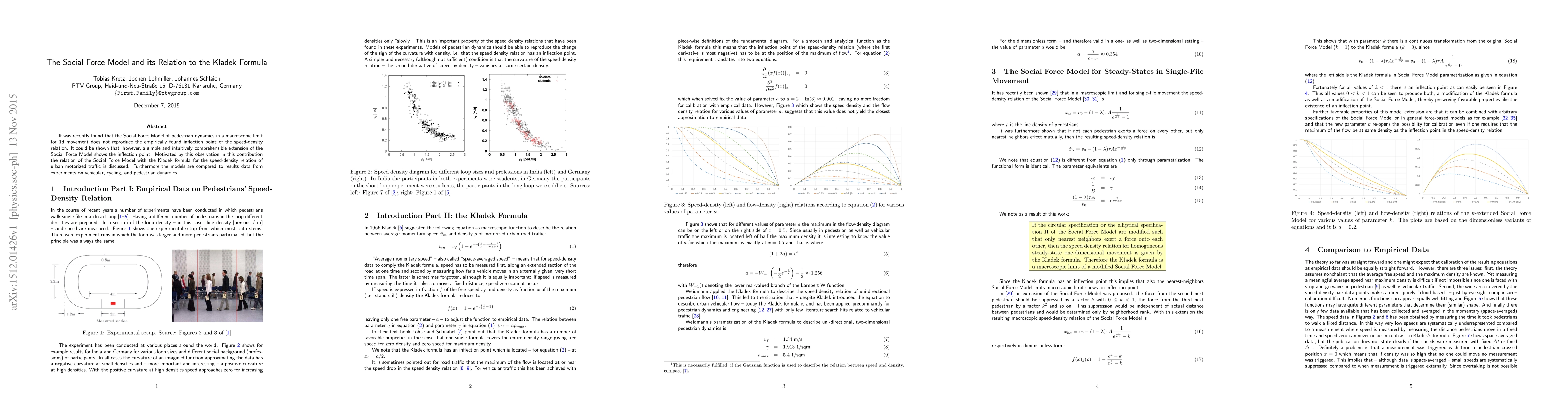 This paper investigates the extension of the Social Force Model to reproduce the empirically observed inflection point in the speed-density relation, and discusses its relation to the Kladek formula used in urban motorized traffic. The modified model is compared against experimental data from vehicular, cycling, and pedestrian dynamics.
