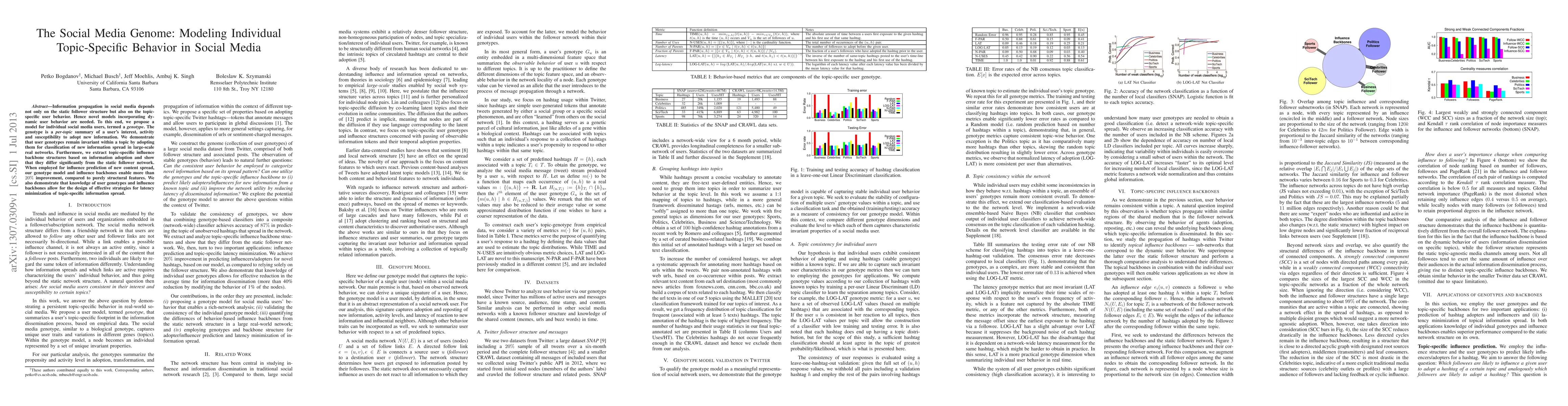 This paper proposes a "genotype" model to capture individual topic-specific behavior in social media, showing that user genotypes remain invariant within topics and improve information spread prediction by over 20% compared to structural features alone. The study also reveals that topic-specific influence backbones differ from static follower networks and can optimize strategies for minimizing information spread latency.