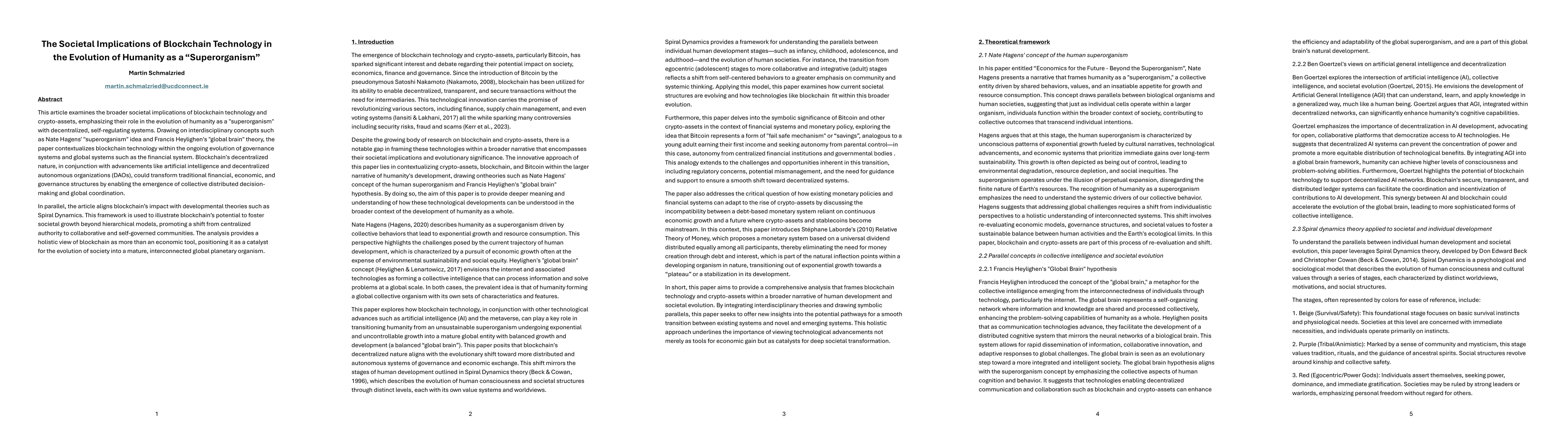 This paper explores how blockchain technology can revolutionize societal structures by fostering decentralized, self-regulating systems, akin to a "superorganism," and potentially transforming traditional governance and economic systems through collective, distributed decision-making. It aligns blockchain's impact with Spiral Dynamics to suggest a shift from centralized hierarchies to collaborative global communities.
