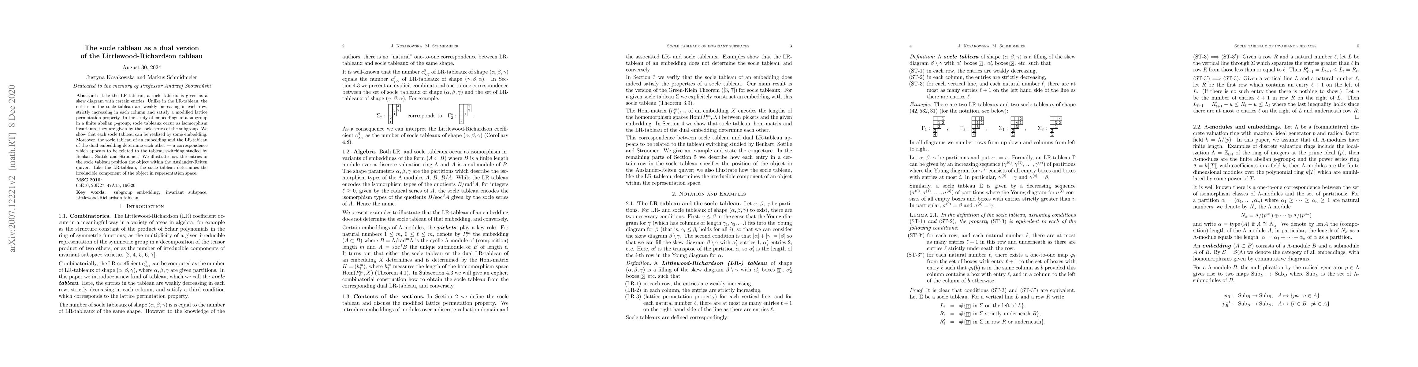 Like the LR-tableau, a socle tableau is given as a skew diagram with certain entries. Unlike in the LR-tableau, the entries in the socle tableau are weakly increasing in each row, strictly increasing in each column and satisfy a modified lattice permutation property. In the study of embeddings of a subgroup in a finite abelian $p$-group, socle tableaux occur as isomorphism invariants, they are given by the socle series of the subgroup. We show that each socle tableau can be realized by some embedding. Moreover, the socle tableau of an embedding and the LR-tableau of the dual embedding determine each other.