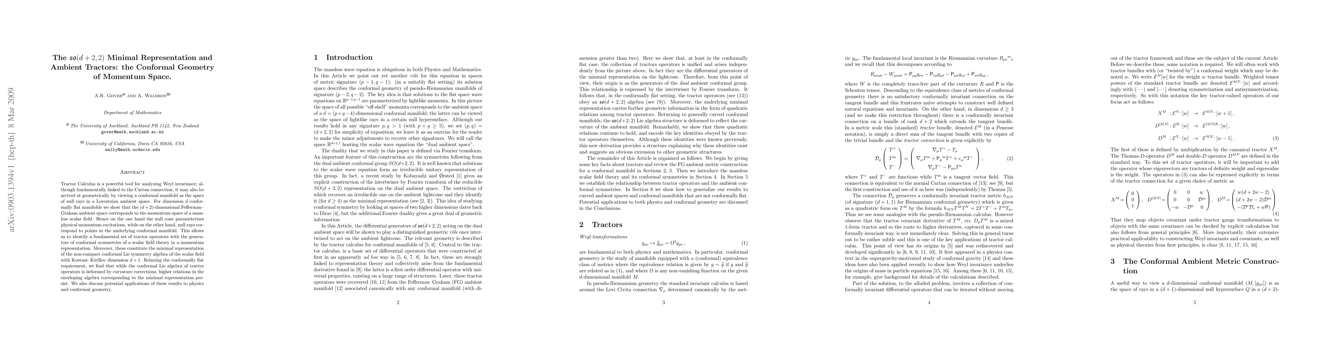 Tractor Calculus is a powerful tool for analyzing Weyl invariance; although fundamentally linked to the Cartan connection, it may also be arrived at geometrically by viewing a conformal manifold as the space of null rays in a Lorentzian ambient space. For dimension d conformally flat manifolds we show that the (d+2)-dimensional Fefferman--Graham ambient space corresponds to the momentum space of a massless scalar field. Hence on the one hand the null cone parameterizes physical momentum excitations, while on the other hand, null rays correspond to points in the underlying conformal manifold. This allows us to identify a fundamental set of tractor operators with the generators of conformal symmetries of a scalar field theory in a momentum representation. Moreover, these constitute the minimal representation of the non-compact conformal Lie symmetry algebra of the scalar field with Kostant--Kirillov dimension d+1. Relaxing the conformally flat requirement, we find that while the conformal Lie algebra of tractor operators is deformed by curvature corrections, higher relations in the enveloping algebra corresponding to the minimal representation persist. We also discuss potential applications of these results to physics and conformal geometry.
