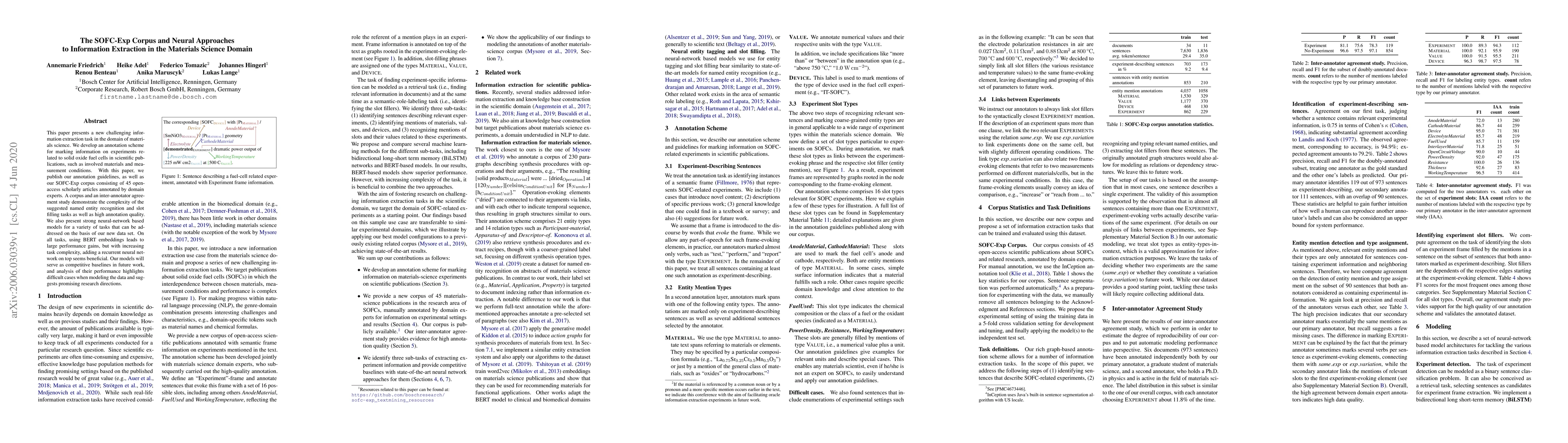 This paper introduces the SOFC-Exp corpus, a new dataset for information extraction in materials science, focusing on solid oxide fuel cells. It includes 45 annotated articles and demonstrates high-quality annotations, alongside neural network models that achieve significant performance gains using BERT embeddings, especially when combined with recurrent neural networks for complex tasks.