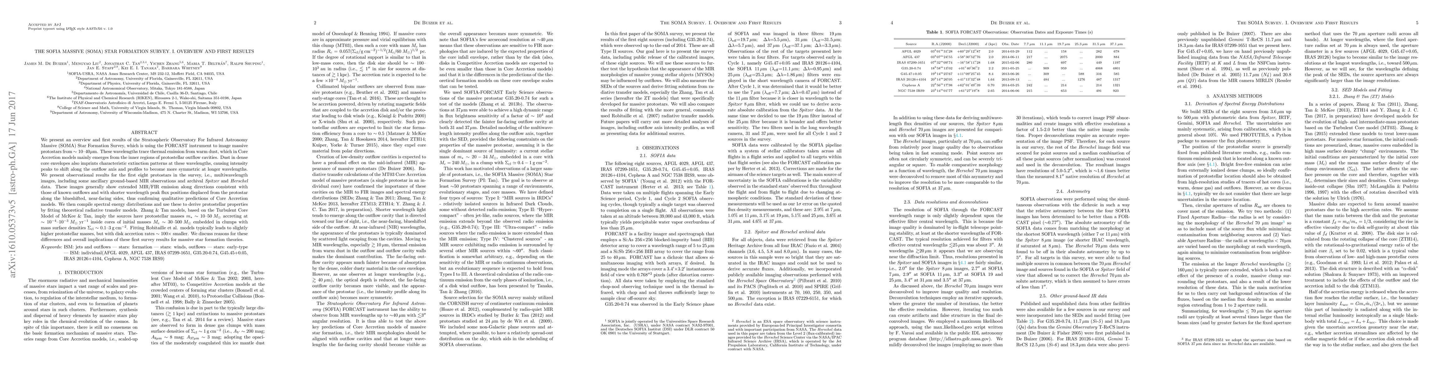 The SOFIA Massive (SOMA) Star Formation Survey presents initial results using the FORCAST instrument to image massive protostars in the infrared, revealing extended emission along outflow directions and confirming predictions of Core Accretion models. Protostellar masses range from $10$--50 $M_\odot$ with accretion rates of $10^{-4}$--$10^{-3} M_\odot yr^{-1}$, suggesting implications for massive star formation theories.