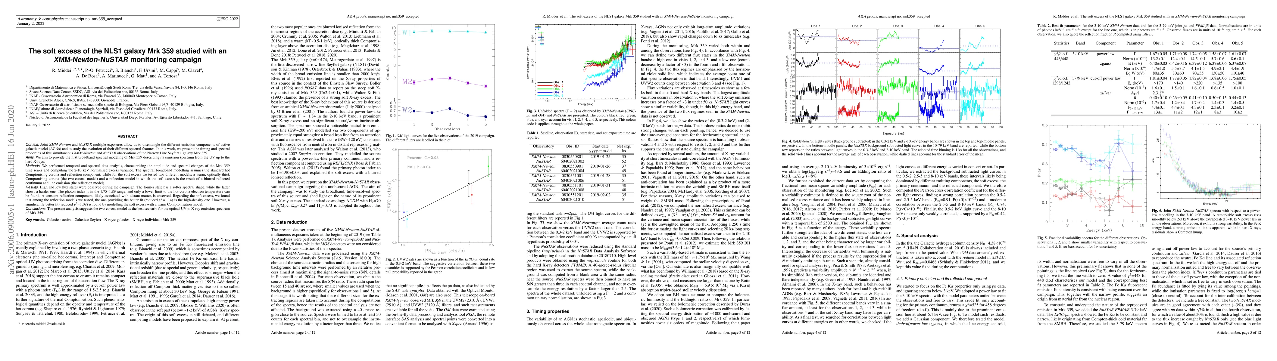 XMM-Newton and NuSTAR multiple exposures allow us to disentangle the different emission components of active galactic nuclei (AGNs) and to study the evolution of their different spectral features. In this work, we present the timing and spectral properties of five simultaneous XMM-Newton and NuSTAR observations of the Narrow Line Seyfert 1 galaxy Mrk 359. We aim to provide the first broadband spectral modeling of Mrk 359 describing its emission spectrum from the UV up to the hard X-rays. To do this, we performed temporal and spectral data analysis, characterising the amplitude and spectral changes of the Mrk 359 time series and computing the 2-10 keV normalised excess variance. The spectral broadband modelling assumes the standard hot Comptonising corona and reflection component, while for the soft excess we tested two different models: a warm, optically thick Comptonising corona (the two-corona model) and a reflection model in which the soft-excess is the result of a blurred reflected continuum and line emission (the reflection model). High and low flux states were observed during the campaign. The former state has a softer spectral shape, while the latter shows a harder one. The photon index is in the 1.75-1.89 range, and only a lower limit to the hot-corona electron temperature can be found. A constant reflection component, likely associated with distant matter, is observed. Regarding the soft excess, we found that among the reflection models we tested, the one providing the better fit (reduced $\chi^2$=1.14) is the high-density one. However, a significantly better fit (reduced $\chi^2$=1.08) is found by modelling the soft excess with a warm Comptonisation model. The present analysis suggests the two-corona model as the best scenario for the optical-UV to X-ray emission spectrum of Mrk 359.