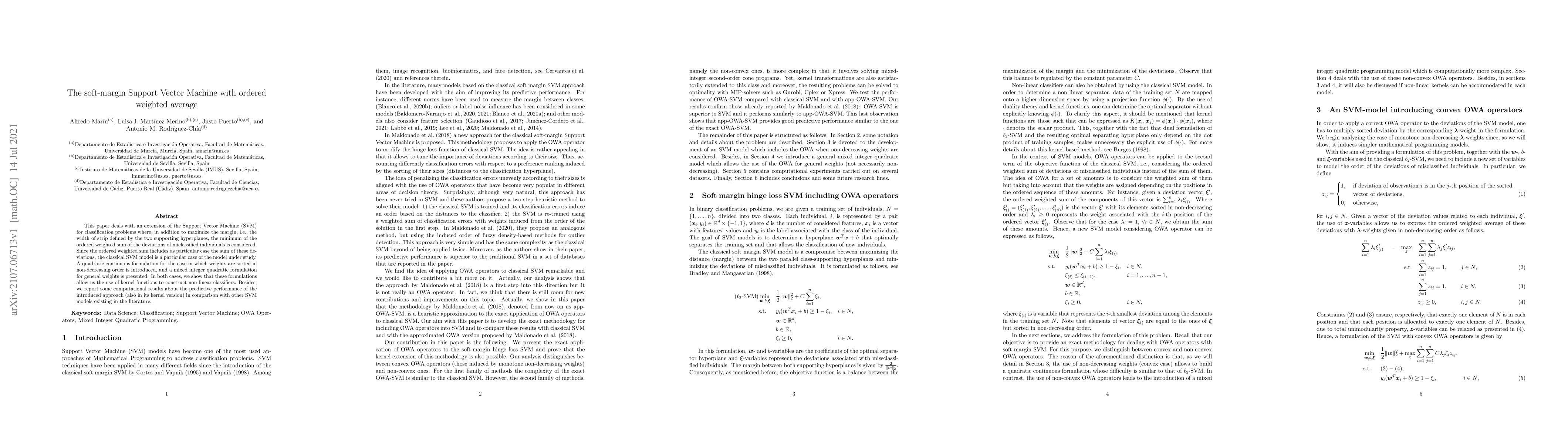 This paper deals with an extension of the Support Vector Machine (SVM) for classification problems where, in addition to maximize the margin, i.e., the width of strip defined by the two supporting hyperplanes, the minimum of the ordered weighted sum of the deviations of miclassified individuals is considered. Since the ordered weighted sum includes as particular case the sum of these deviations, the classical SVM model is a particular case of the model under study. A quadratic continuous formulation for the case in which weights are sorted in non-decreasing order is introduced, and a mixed integer quadratic formulation for general weights is presented. In both cases, we show that these formulations allow us the use of kernel functions to construct non linear classifiers. Besides, we report some computational results about the predictive performance of the introduced approach (also in its kernel version) in comparison with other SVM models existing in the literature.