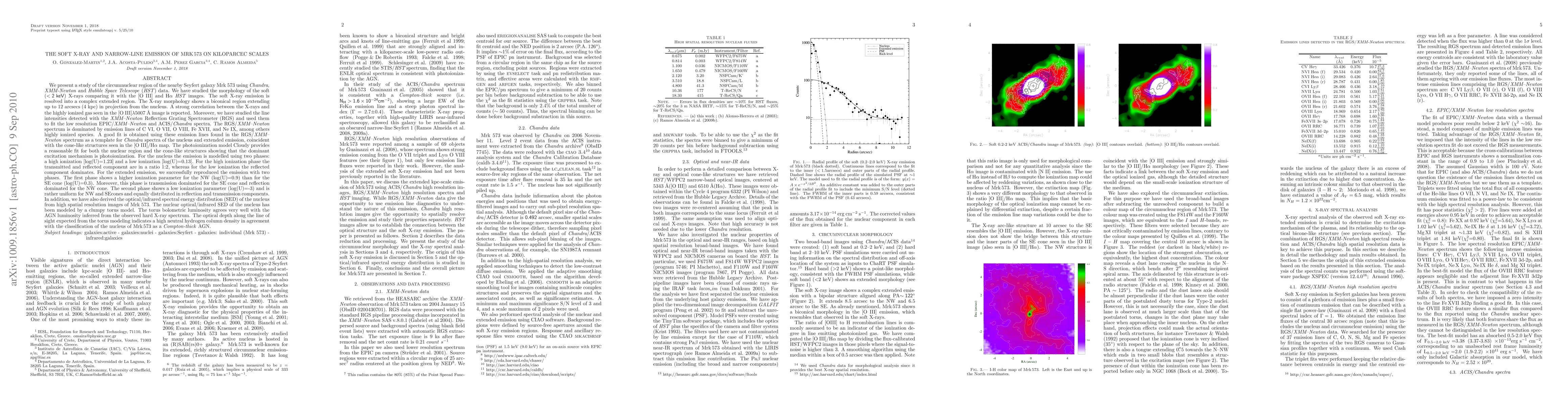 We present a study of the circumnuclear region of the nearby Seyfert galaxy Mrk573 using Chandra, XMM-Newton and HST data. The X-ray morphology shows a biconical region extending up to 12 arcsecs (4 kpc) in projection from the nucleus. A strong correlation between the X-rays and the highly ionized gas seen in the [O III] image is reported. Moreover, we have studied the line intensities detected with the RGS/XMM-Newton and used them to fit the low resolution EPIC/XMM-Newton and ACIS/Chandra spectra. The RGS spectrum is dominated by emission lines of C VI, O VII, O VIII, Fe XVII, and Ne IX, among others. A good fit is obtained using these emission lines found in the RGS spectrum as a template for Chandra spectra of the nucleus and extended emission. The photoionization model Cloudy provides a reasonable fit for both the nuclear region and the cone-like structures. For the nucleus the emission is modelled using two phases: a high ionization [log(U)=1.23] and a low ionization [log(U)=0.13]. For the high ionization phase the transmitted and reflected component are in a ratio 1:2, whereas for the low ionization the reflected component dominates. For the extended emission, we successfully reproduced the emission with two phases. The first phase shows a higher ionization parameter for the NW (log(U)=0.9) than for the SE cone (log(U)=0.3). The second phase shows a low ionization parameter (log(U)=-3) and is rather uniform for NW and SE cones. In addition, the nuclear optical/infrared SED has been modeled by a clumpy torus model. The torus bolometric luminosity agrees with the AGN luminosity inferred from the observed hard X-ray spectrum. The optical depth along the line of sight derived from the SED fit indicates a high neutral column density in agreement with the classification of the nucleus as a Compton-thick AGN.