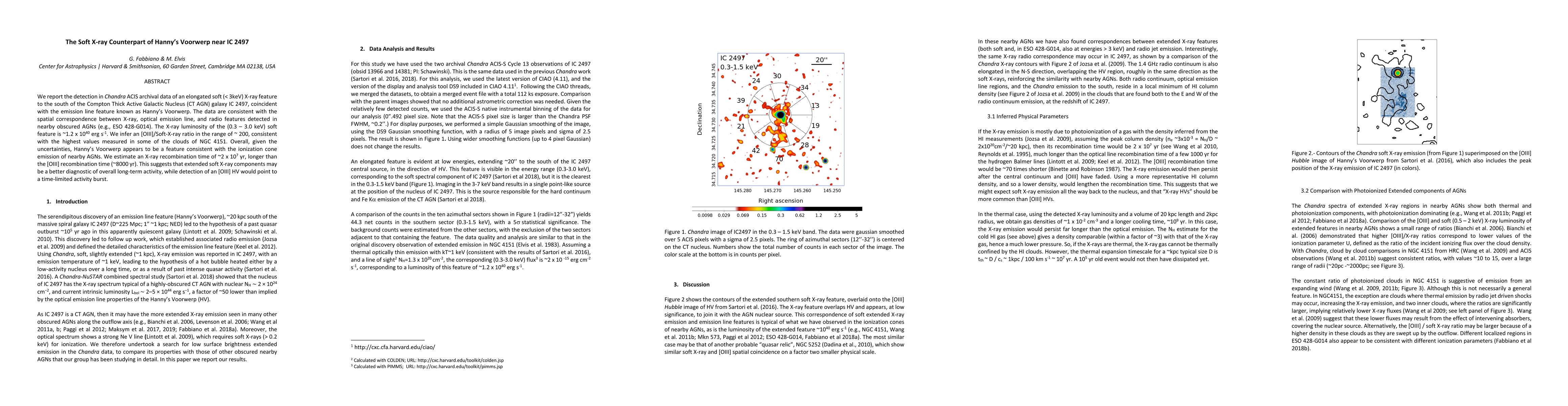 We report the detection in Chandra ACIS archival data of an elongated soft (<3 keV) X-ray feature tp the south of the Compton Thick Active Galactic Nucleus (CT AGN) galaxy IC 2497, coincident with the emission feature known as Hanny's Voorwerp (HV). The data are consistent with the spatial correspondence between X-ray, optical emission line, and radio features detected in nearby obscured AGNs (e.g., ESO 428-G014). The X-ray luminosity of the (0.3-3.0 keV) soft feature is ~1.2x10^40 erg/s. We infer an [OIII]/Soft-X-ray ratio in the range of ~200, consistent with the highest values measured in some of the clouds of NGC 4151. Overall, given the uncertainties, Hanny's Voorwerp appears to be a feature consistent with the ionization cone emission of nearby AGNs. We estimate an X-ray recombination time of 2x10^7 yr, longer than the [OIII] recombination time (~8000 yr). This suggests that extended soft X-ray components may be a better diagnostic of overall long-term activity, while detection of an [OIII] HV would point to a time-limited activity burst.