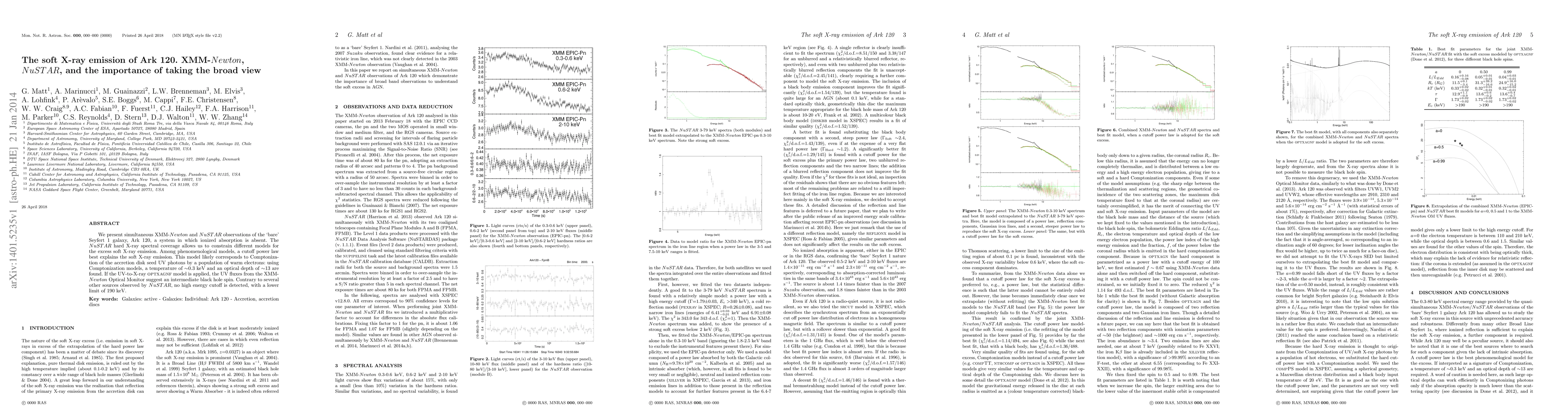 This study uses XMM-Newton and NuSTAR observations to analyze the soft X-ray emission of the Seyfert 1 galaxy Ark 120, finding a cutoff power law best explains the excess soft X-ray emission likely due to Comptonization. No high-energy cutoff is detected, suggesting an intermediate black hole spin.