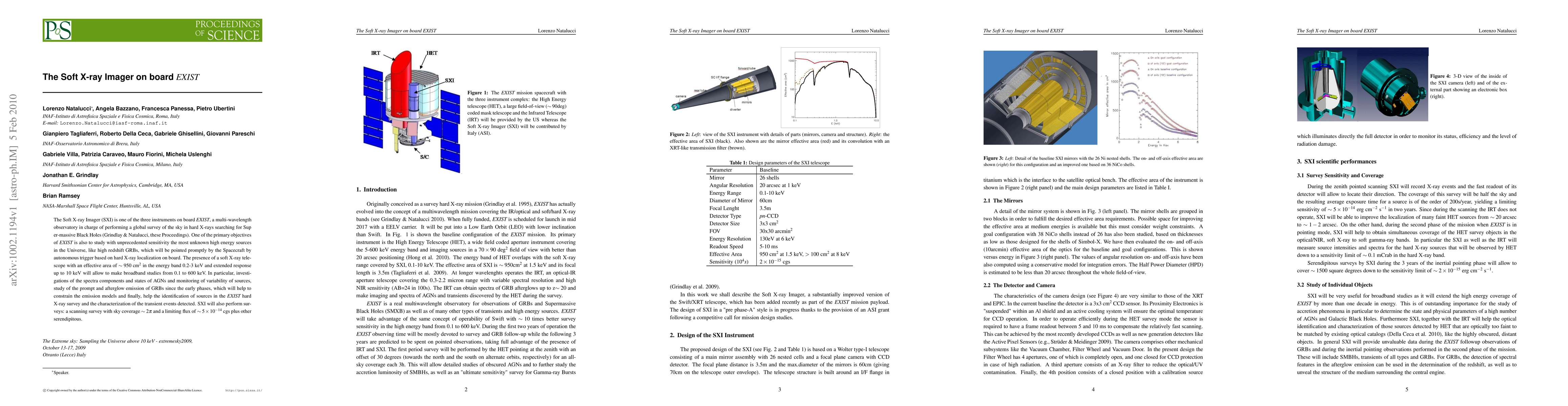 The Soft X-ray Imager (SXI) is one of the three instruments on board EXIST, a multi-wavelength observatory in charge of performing a global survey of the sky in hard X-rays searching for Super-massive Black Holes (Grindlay & Natalucci, these Proceedings). One of the primary objectives of EXIST is also to study with unprecedented sensitivity the most unknown high energy sources in the Universe, like high redshift GRBs, which will be pointed promptly by the Spacecraft by autonomous trigger based on hard X-ray localization on board. The presence of a soft X-ray telescope with an effective area of about 950cm2 in the energy band 0.2-3 keV and extended response up to 10 keV will allow to make broadband studies from 0.1 to 600 keV. In particular, investigations of the spectra components and states of AGNs and monitoring of variability of sources, study of the prompt and afterglow emission of GRBs since the early phases, which will help to constrain the emission models and finally, help the identification of sources in the EXIST hard X-ray survey and the characterization of the transient events detected. SXI will also perform surveys: a scanning survey with sky coverage 2pi and a limiting flux of 5x10^(-14) cgs plus other serendipitous.
