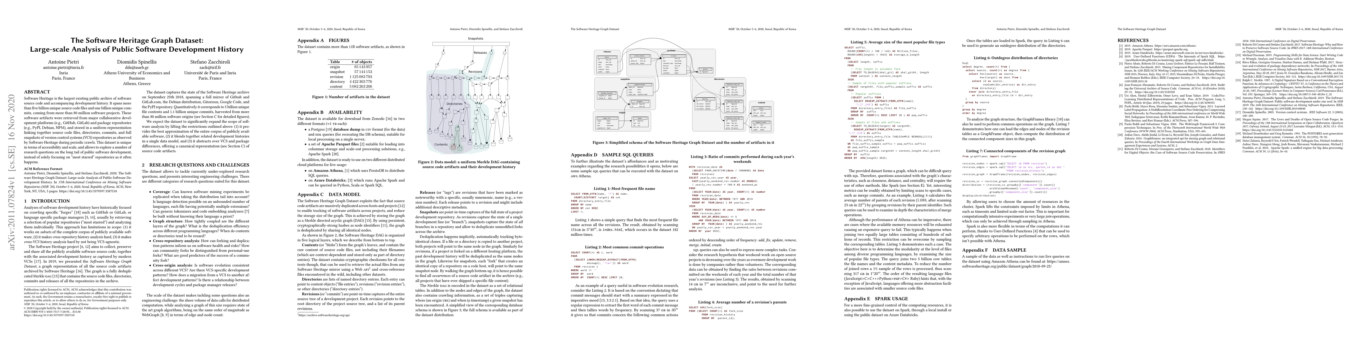 Software Heritage is the largest existing public archive of software source code and accompanying development history. It spans more than five billion unique source code files and one billion unique commits , coming from more than 80 million software projects. These software artifacts were retrieved from major collaborative development platforms (e.g., GitHub, GitLab) and package repositories (e.g., PyPI, Debian, NPM), and stored in a uniform representation linking together source code files, directories, commits, and full snapshots of version control systems (VCS) repositories as observed by Software Heritage during periodic crawls. This dataset is unique in terms of accessibility and scale, and allows to explore a number of research questions on the long tail of public software development, instead of solely focusing on ''most starred'' repositories as it often happens.