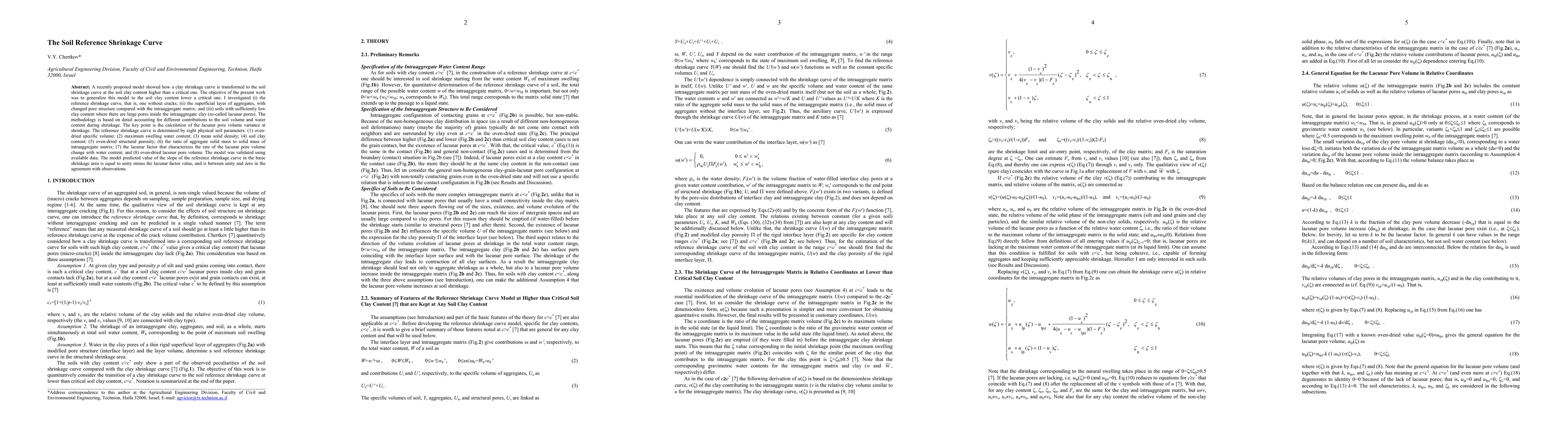 A recently proposed model showed how a clay shrinkage curve is transformed to the soil shrinkage curve at the soil clay content higher than a critical one. The objective of the present work was to generalize this model to the soil clay content lower a critical one. I investigated (i) the reference shrinkage curve, that is, one without cracks; (ii) the superficial layer of aggregates, with changed pore structure compared with the intraaggregate matrix; and (iii) soils with sufficiently low clay content where there are large pores inside the intraaggregate clay (so-called lacunar pores). The methodology is based on detail accounting for different contributions to the soil volume and water content during shrinkage. The key point is the calculation of the lacunar pore volume variance at shrinkage. The reference shrinkage curve is determined by eight physical soil parameters: (1) oven-dried specific volume; (2) maximum swelling water content; (3) mean solid density; (4) soil clay content; (5) oven-dried structural porosity; (6) the ratio of aggregate solid mass to solid mass of intraaggregate matrix; (7) the lacunar factor that characterizes the rate of the lacunar pore volume change with water content; and (8) oven-dried lacunar pore volume. The model was validated using available data. The model predicted value of the slope of the reference shrinkage curve in the basic shrinkage area is equal to unity minus the lacunar factor value, and is between unity and zero in the agreement with observations.