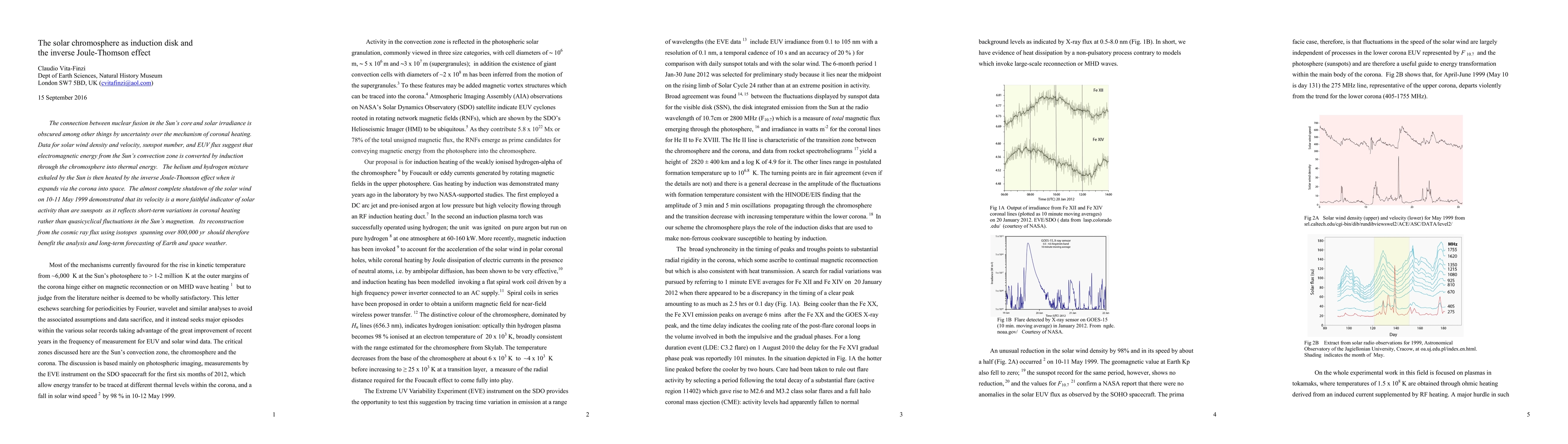 The connection between nuclear fusion in the Sun's core and solar irradiance is obscured among other things by uncertainty over the mechanism of coronal heating. Data for solar wind density and velocity, sunspot number, and EUV flux suggest that electromagnetic energy from the Sun's convection zone is converted by induction through the chromosphere into thermal energy. The helium and hydrogen mixture exhaled by the Sun is then heated by the inverse Joule-Thomson effect when it expands via the corona into space. The almost complete shutdown of the solar wind on 10-11 May 1999 demonstrated that its velocity is a more faithful indicator of solar activity than are sunspots as it reflects short-term variations in coronal heating rather than quasicyclical fluctuations in the Sun's magnetism. Its reconstruction from the cosmic ray flux using isotopes spanning over 800,000 yr should therefore benefit the analysis and long-term forecasting of Earth and space weather.