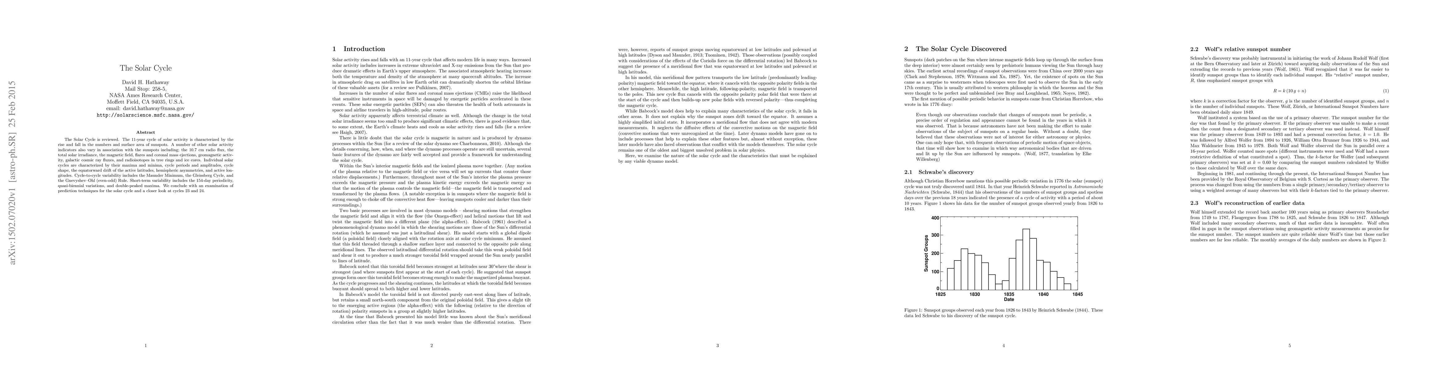 The Solar Cycle is reviewed. The 11-year cycle of solar activity is characterized by the rise and fall in the numbers and surface area of sunspots. A number of other solar activity indicators also vary in association with the sunspots including; the 10.7cm radio flux, the total solar irradiance, the magnetic field, flares and coronal mass ejections, geomagnetic activity, galactic cosmic ray fluxes, and radioisotopes in tree rings and ice cores. Individual solar cycles are characterized by their maxima and minima, cycle periods and amplitudes, cycle shape, the equatorward drift of the active latitudes, hemispheric asymmetries, and active longitudes. Cycle-to-cycle variability includes the Maunder Minimum, the Gleissberg Cycle, and the Gnevyshev-Ohl (even-odd) Rule. Short-term variability includes the 154-day periodicity, quasi-biennial variations, and double-peaked maxima. We conclude with an examination of prediction techniques for the solar cycle and a closer look at cycles 23 and 24.