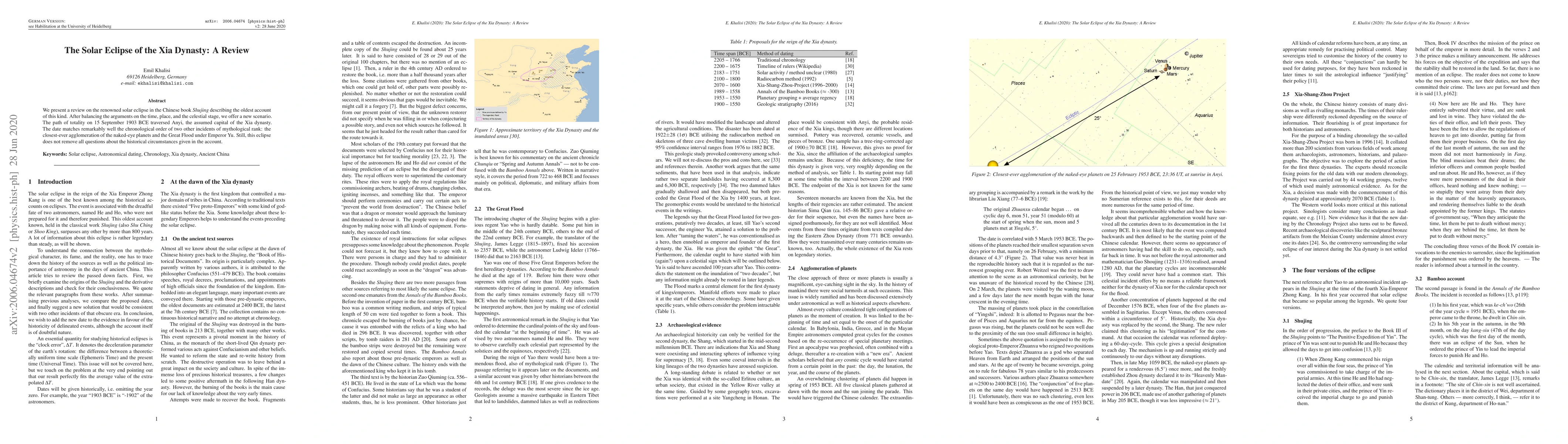 This paper reviews the ancient solar eclipse described in the "Shujing," proposing that the path of totality crossed Anyi in 1903 BCE, aligning with significant mythological events. Despite this, uncertainties remain regarding the historical context of the eclipse account.