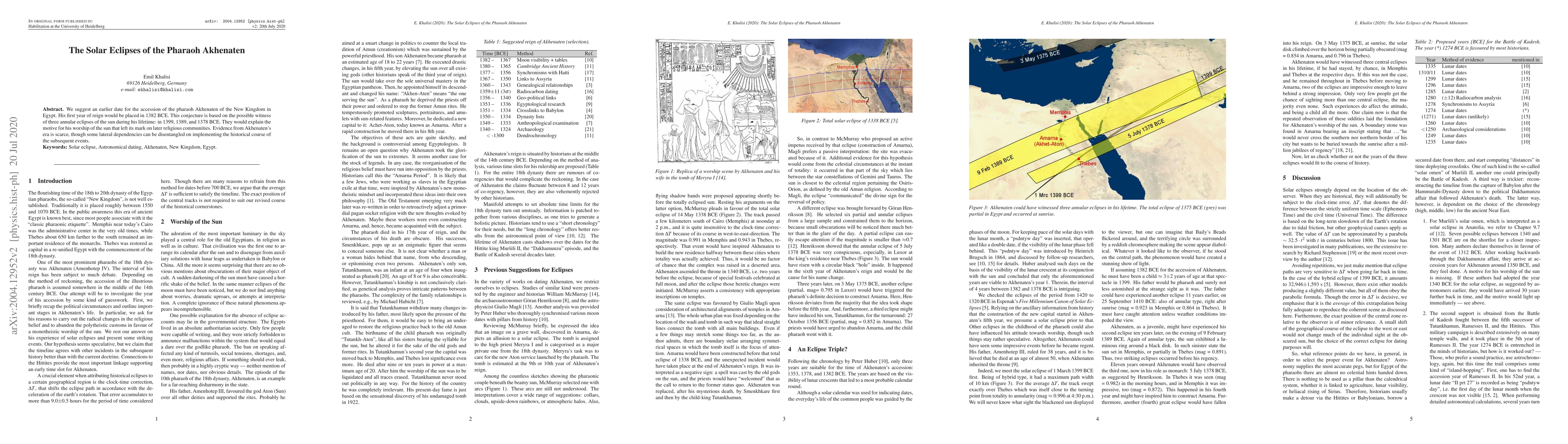 The paper proposes an earlier accession date for Pharaoh Akhenaten in 1382 BCE, supported by three solar eclipse observations during his reign: 1399, 1389, and 1378 BCE. This suggests a possible motivation for his sun worship, despite limited evidence from his era.