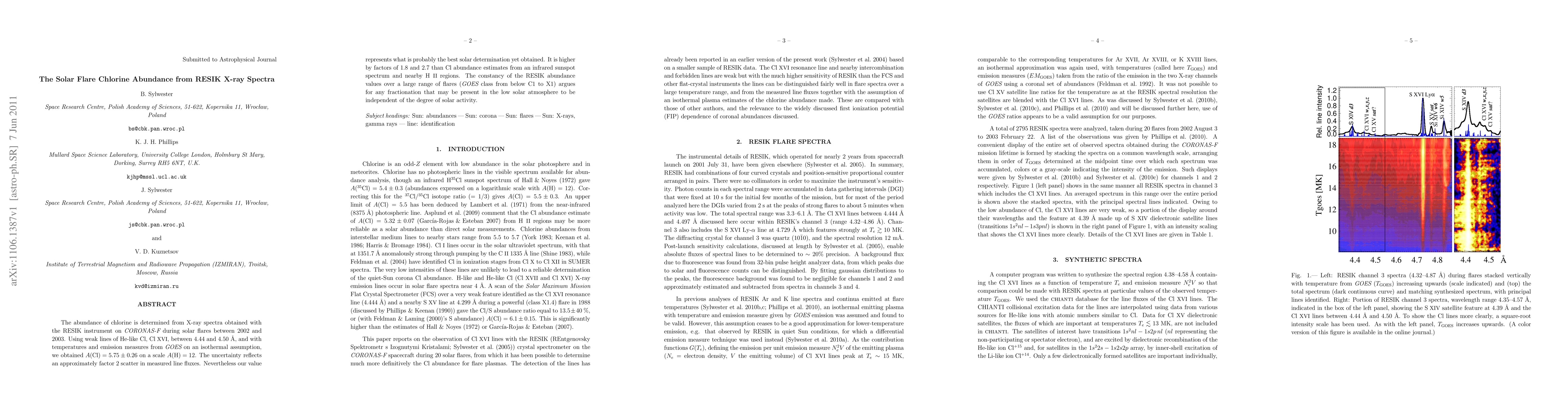 This study determines chlorine abundance in solar flares using RESIK X-ray spectra, finding $A({\rm Cl}) = 5.75 \pm 0.26$ on a scale of $A({\rm H}) = 12$, which is higher than previous estimates from sunspots and nearby H2 regions. The consistency across various flare intensities suggests no significant fractionation related to solar activity.