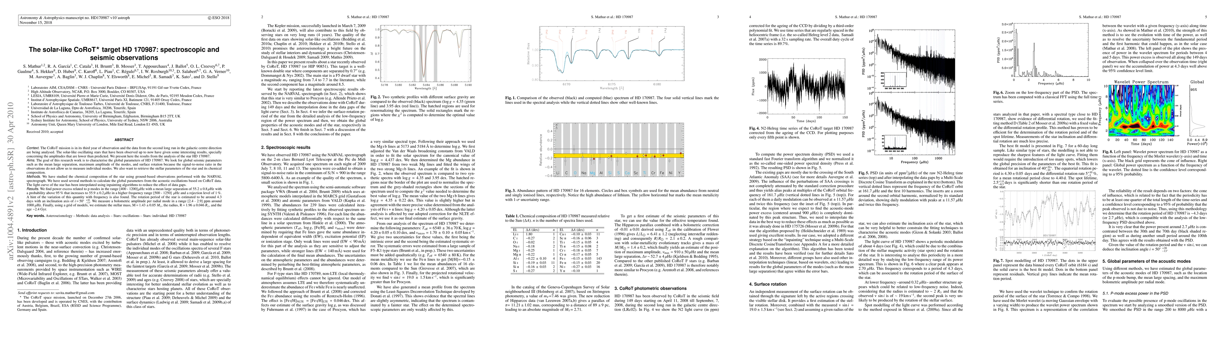 The CoRoT mission is in its third year of observation and the data from the second long run in the galactic centre direction are being analysed. The solar-like oscillating stars that have been observed up to now have given some interesting results, specially concerning the amplitudes that are lower than predicted. We present here the results from the analysis of the star HD 170987.The goal of this research work is to characterise the global parameters of HD 170987. We look for global seismic parameters such as the mean large separation, maximum amplitude of the modes, and surface rotation because the signal-to-noise ratio in the observations do not allow us to measure individual modes. We also want to retrieve the stellar parameters of the star and its chemical composition.We have studied the chemical composition of the star using ground-based observations performed with the NARVAL spectrograph. We have used several methods to calculate the global parameters from the acoustic oscillations based on CoRoT data. The light curve of the star has been interpolated using inpainting algorithms to reduce the effect of data gaps. We find power excess related to p modes in the range [400 - 1200]muHz with a mean large separation of 55.2+-0.8muHz with a probability above 95% that increases to 55.9 +-0.2muHz in a higher frequency range [500 - 1250] muHz and a rejection level of 1%. A hint of the variation of this quantity with frequency is also found. The rotation period of the star is estimated to be around 4.3 days with an inclination axis of i=50 deg +20/-13. We measure a bolometric amplitude per radial mode in a range [2.4 - 2.9] ppm around 1000 muHz. Finally, using a grid of models, we estimate the stellar mass, M=1.43+-0.05 Msun, the radius, R=1.96+-0.046 Rsun, and the age ~2.4 Gyr.