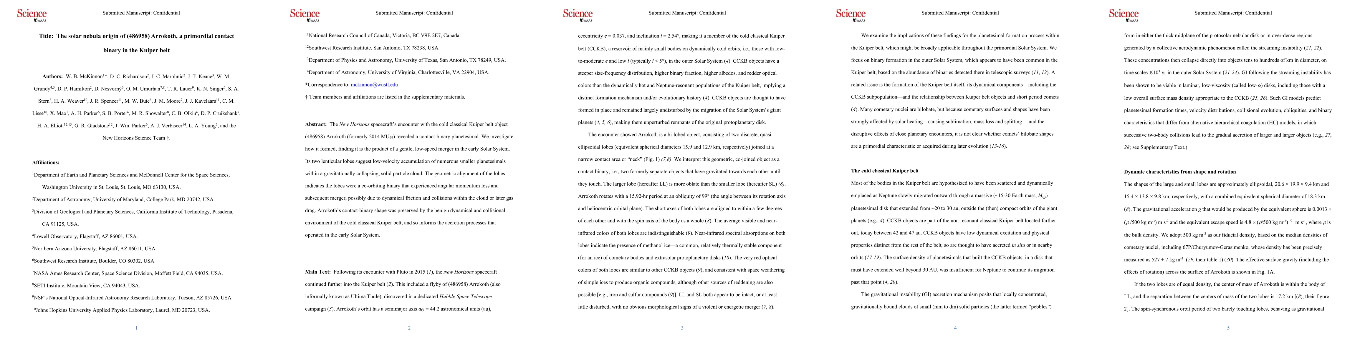 The New Horizons spacecraft discovered that (486958) Arrokoth, a Kuiper belt object, formed through a low-speed merger of smaller planetesimals in the early Solar System, preserving its contact-binary shape due to the cold classical Kuiper belt's stable environment. This formation process provides insights into early Solar System accretion dynamics.