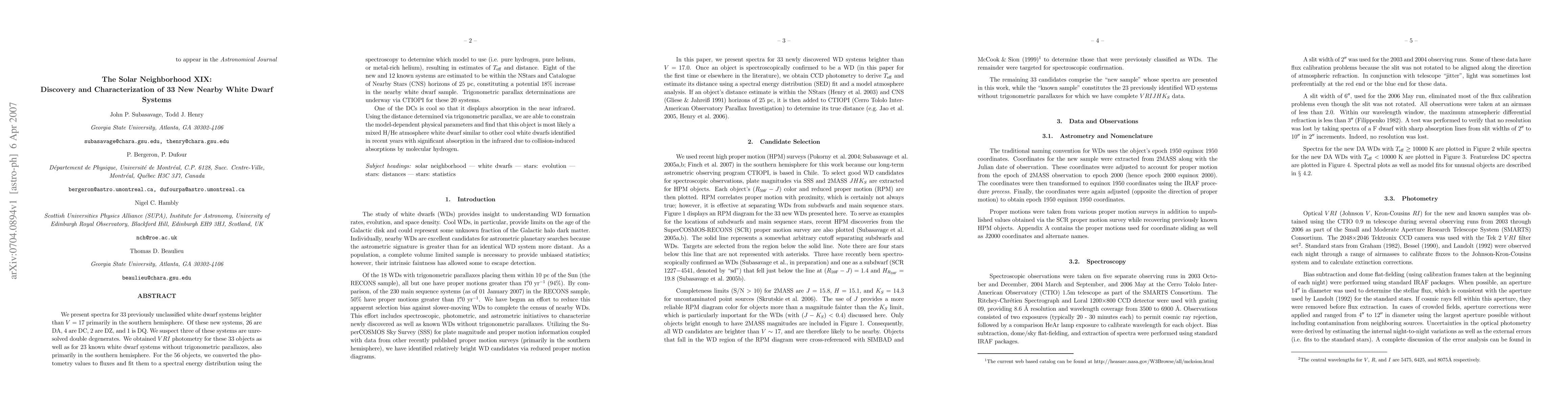 We present spectra for 33 previously unclassified white dwarf systems brighter than V = 17 primarily in the southern hemisphere. Of these new systems, 26 are DA, 4 are DC, 2 are DZ, and 1 is DQ. We suspect three of these systems are unresolved double degenerates. We obtained VRI photometry for these 33 objects as well as for 23 known white dwarf systems without trigonometric parallaxes, also primarily in the southern hemisphere. For the 56 objects, we converted the photometry values to fluxes and fit them to a spectral energy distribution using the spectroscopy to determine which model to use (i.e. pure hydrogen, pure helium, or metal-rich helium), resulting in estimates of effective temperature and distance. Eight of the new and 12 known systems are estimated to be within the NStars and Catalogue of Nearby Stars (CNS) horizons of 25 pc, constituting a potential 18% increase in the nearby white dwarf sample. Trigonometric parallax determinations are underway via CTIOPI for these 20 systems. One of the DCs is cool so that it displays absorption in the near infrared. Using the distance determined via trigonometric parallax, we are able to constrain the model-dependent physical parameters and find that this object is most likely a mixed H/He atmosphere white dwarf similar to other cool white dwarfs identified in recent years with significant absorption in the infrared due to collision-induced absorptions by molecular hydrogen.