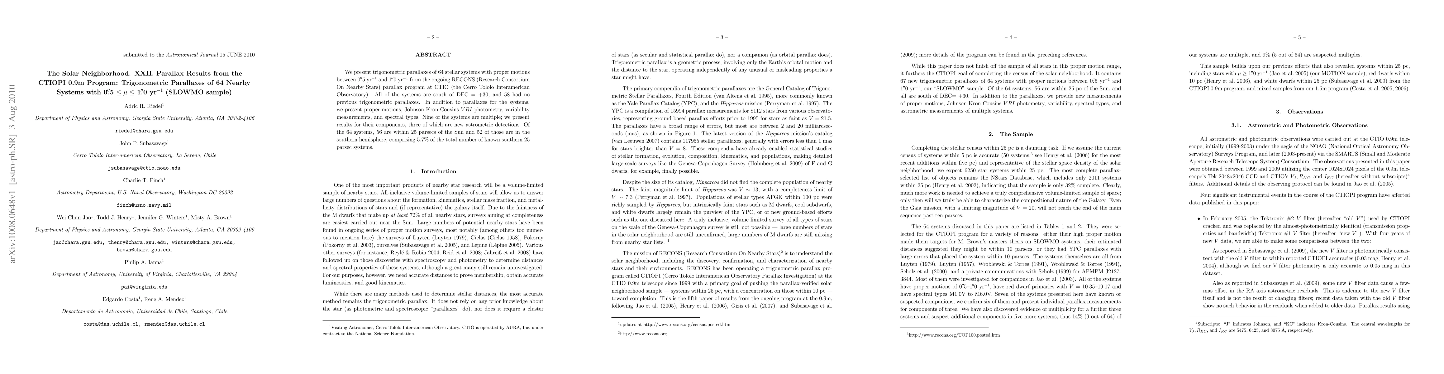 This paper reports trigonometric parallaxes for 64 nearby stellar systems, including 58 with no prior parallax measurements, from the RECONS program at CTIO. The study also provides proper motions, $VRI$ photometry, variability data, and spectral types, with three new astrometric detections among multiple systems.
