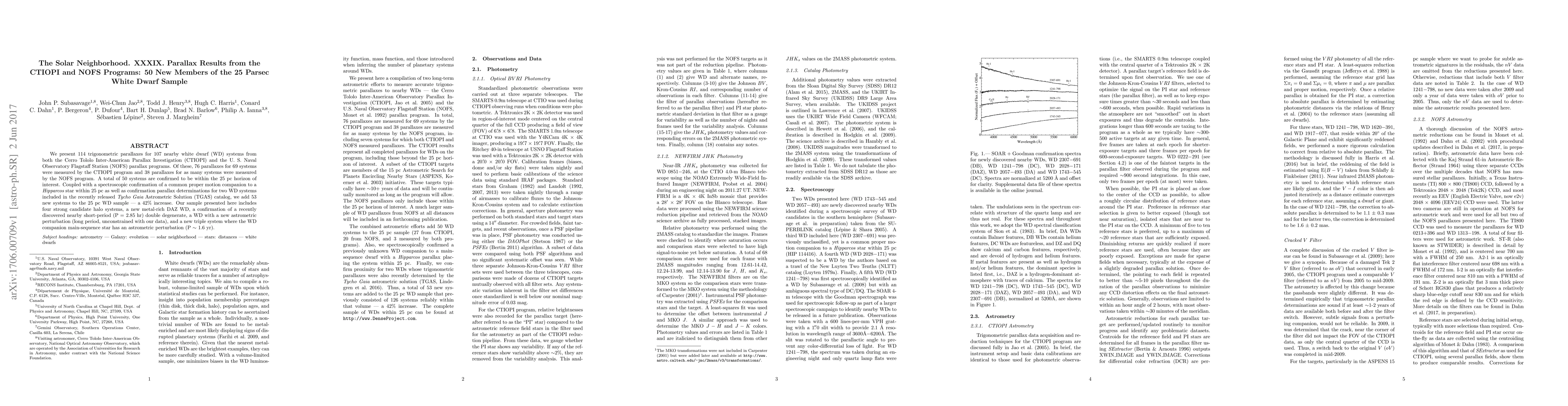 This paper reports 114 new trigonometric parallaxes for 107 nearby white dwarf systems, significantly expanding the 25 parsec white dwarf sample by 42%. The study identifies 50 new systems within the 25 pc horizon, including four candidate halo systems and a new metal-rich DAZ white dwarf.
